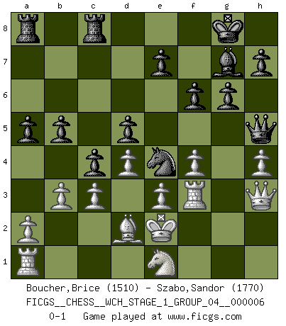 Last move : 0-1 2009 May 11 5:31:15 [Event "FICGS__CHESS__WCH_STAGE_1_GROUP_04__000006"] [Site "FICGS"] [Date "2009.02.03"] [Round "1"] [White "Boucher,Brice"] [Black "Szabo,Sandor"] [Result "0-1"] [WhiteElo "1510"] [BlackElo "1770"] 1.f4 d5 2.Nf3 Nf6 3.e3 g6 4.d4 Bg7 5.Bd3 O-O 6.O-O c5 7.Ne5 Qc7 8.g4 c4 9.Be2 Ne4 10.Nd2 Nxd2 11.Bxd2 f6 12.Nf3 Bxg4 13.c3 Bh3 14.Rf2 Nc6 15.Bf1 Be6 16.Bg2 Qd6 17.Qf1 Bf5 18.Ne1 Qe6 19.Rf3 Nd8 20.Bh3 Nf7 21.Bxf5 Qxf5 22.Qh3 Qe4 23.Qg2 Nd6 24.b3 Rfc8 25.Rg3 Qe6 26.h4 Ne4 27.Rf3 Qf5 28.Kf1 b5 29.Ke2 Qh5 30.Qh3 a5 0-1 This chess game has been lost on time (started : 2009.02.03 12:38:13) Bird's Opening Kingside Castling by player Black (move 5) Kingside Castling by player White (move 6) Player Black won this chess game. Follow this game move after move (download)Weak points or holes in the opponent's position must be occupied by pieces not Pawns. (Siegbert Tarrasch) Schach wird sich dank seiner hohen kulturellen Tradition immer durchsetzen. In näherer Zukunft womöglich sogar als Gegenreaktion auf die maßlose Reizüberflutung im Freizeit- und Spielbereich. (Garry Kasparov) El jugador táctico sabe que hacer cuando hay algo que hacer; mientras que el estratega sabe que hacer cuando no hay nada que hacer. (Gerald Abrahams) Mais n'est-ce pas déjà le limiter injurieusement que d'appeler les échecs un jeu? N'est-ce pas aussi une science, un art, ou quelque chose qui, comme le cercueil de Mahomet entre ciel et terre, est suspendu entre l'un et l'autre, et qui réunit un nombre incroyable de contraires ? (Stefan Zweig) After growing wildly for years, the field of computing appears to be reaching its infancy. (John Pierce)