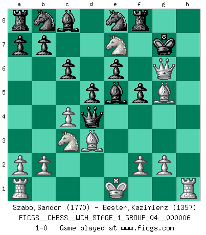 Last move : 1-0 2009 April 13 14:38:25 [Event "FICGS__CHESS__WCH_STAGE_1_GROUP_04__000006"] [Site "FICGS"] [Date "2009.02.03"] [Round "1"] [White "Szabo,Sandor"] [Black "Bester,Kazimierz"] [Result "1-0"] [WhiteElo "1770"] [BlackElo "1357"] 1.d4 Nf6 2.c4 g6 3.Nc3 Bg7 4.e4 O-O 5.Nf3 c6 6.Bd3 e6 7.e5 Ne8 8.h4 f5 9.h5 d5 10.hxg6 hxg6 11.Bg5 Qb6 12.Nh4 Qxd4 13.Nxg6 Bxe5 14.Ne7+ Kf7 15.Qh5+ Kg7 16.Qg6+ 1-0 This chess game has been lost on time (started : 2009.02.03 12:38:13) King's Indian : 4.e4 Kingside Castling by player Black (move 4) Player White won this chess game. Follow this game move after move (download)He who fears an isolated Queen's Pawn should give up Chess. (Siegbert Tarrasch) Schach ist ein Teil der Kultur, und wenn es mit der Kultur abwärts geht, geht es auch mit dem Schach abwärts. (Mikhail Moiseyevich Botvinik) Yo no creo en la psicología. Yo creo en las buenas movidas. (Bobby Fischer) Vous m'avez demandé de vous exposer quel est le fondement de la prière. Je ne fais que préparer les pièces du jeu sur la table... Nous sera-t-il permis d'en adopter les règles et si nous les appliquons scrupuleusement nous ne tarderons pas à faire mat le Roi divin ! Il ne pourra échapper à nos mains. (Sainte Thérèse d'Avila, Chemin de perfection) 98% of all statistics are made up. (Author unknown)
