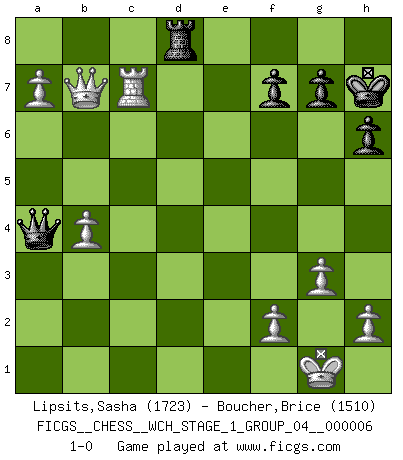 Last move : 1-0 2009 March 30 6:35:21 [Event "FICGS__CHESS__WCH_STAGE_1_GROUP_04__000006"] [Site "FICGS"] [Date "2009.02.03"] [Round "1"] [White "Lipsits,Sasha"] [Black "Boucher,Brice"] [Result "1-0"] [WhiteElo "1723"] [BlackElo "1510"] 1.d4 d5 2.c4 e6 3.Nf3 Nf6 4.g3 Be7 5.Bg2 O-O 6.Qc2 Nc6 7.O-O Nb4 8.Qb3 c5 9.dxc5 Bxc5 10.Nc3 b6 11.cxd5 Nbxd5 12.Bg5 Bb7 13.Ne4 Be7 14.Nxf6+ Bxf6 15.Bxf6 Qxf6 16.e4 Ne7 17.e5 Qh6 18.Rac1 Nd5 19.Nd4 Rac8 20.Rxc8 Rxc8 21.Qa4 Qd2 22.Qxa7 Qxd4 23.Qxb7 Qc5 24.Bxd5 exd5 25.b4 Qc4 26.a4 h6 27.Qxb6 Qe4 28.a5 Qxe5 29.a6 Rb8 30.Qc5 Qe8 31.a7 Rc8 32.Qxd5 Rd8 33.Qb7 Qa4 34.Rc1 Kh7 35.Rc7 1-0 Queen's gambit declined Kingside Castling by player Black (move 5) Kingside Castling by player White (move 7) Player White won this chess game. Follow this game move after move (download)For me, Chess is life and every game is like a new life. Every Chess player gets to live many lives in one lifetime. (Eduard Gufeld) Spielt Blackmar-Diemer-Gambit, und das Matt kommt von selbst! (Emil Joseph Diemer) El Ajedrez es un juego terrible. Si no dominas el centro, tu oponente tiene una posición mas libre. Si tu tienes el centro, entonces realmente tienes algo de que preocuparte. (Siegbert Tarrasch) Les écrivains ont utilisé les échecs pour analyser les côtés extrêmes de la nature humaine. Dans ce cadre, les échecs offrent un champ d'expérimentation idéal. Mais on pourrait faire la même chose avec la peinture. Et là, en vous référant à Van Gogh, vous ne tirerez pas de conclusion définitive sur les peintres. (Gary Kasparov) Life is like a game of cards: the hand you are dealt represents determinism; the way you play it is free will. (Jawaharlal Nehru)