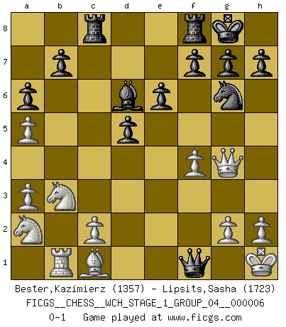 Last move : 0-1 2009 April 6 2:12:45 [Event "FICGS__CHESS__WCH_STAGE_1_GROUP_04__000006"] [Site "FICGS"] [Date "2009.02.03"] [Round "1"] [White "Bester,Kazimierz"] [Black "Lipsits,Sasha"] [Result "0-1"] [WhiteElo "1357"] [BlackElo "1723"] 1.e4 e6 2.Nf3 d5 3.e5 c5 4.d4 cxd4 5.Nxd4 Ne7 6.Bb5+ Bd7 7.Nc3 a6 8.Bxd7+ Nxd7 9.Bg5 Nxe5 10.O-O Qb6 11.Rb1 N7g6 12.a4 Bd6 13.Be3 Qb4 14.f4 Nc4 15.Bc1 Bc5 16.Kh1 O-O 17.Nb3 Bd6 18.a5 Rac8 19.Qg4 Na3 20.Na2 Qb5 21.bxa3 Qxf1+ 0-1 This chess game has been lost on time (started : 2009.02.03 12:38:13) French defense Kingside Castling by player White (move 10) Kingside Castling by player Black (move 16) Player Black won this chess game. Follow this game move after move (download)First-class players lose to second class players because second-class players sometimes play a first-class game. (Tarrasch) Die FIDE ist dabei in die Hände der russischen Mafia zu fallen. (Larry Evans) Te sientas frente a un tablero y repentinamente tu corazón brinca. Tu mano tiembla al tomar una pieza y moverla. Pero lo que el Ajedrez te enseña es que tu debes permanecer ahí con calma y pensar de que si realmente es una buena idea o de que si hay otras ideas mejores. (Stanley Kubrick) RxDa4 pat (...) A woman without a man is like a fish without a bicycle. (Gloria Steinem)
