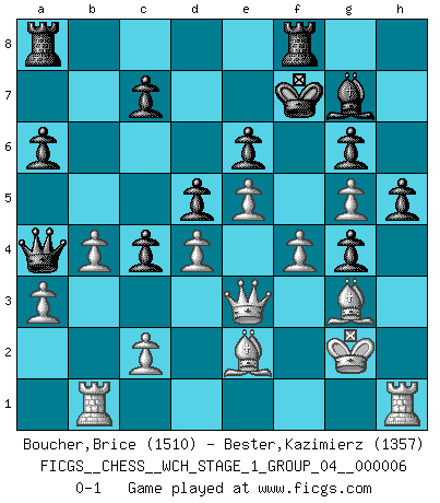 Last move : 0-1 2009 May 2 4:37:36 [Event "FICGS__CHESS__WCH_STAGE_1_GROUP_04__000006"] [Site "FICGS"] [Date "2009.02.03"] [Round "1"] [White "Boucher,Brice"] [Black "Bester,Kazimierz"] [Result "0-1"] [WhiteElo "1510"] [BlackElo "1357"] 1.f4 Nc6 2.Nf3 e6 3.e4 g6 4.d4 Bg7 5.Nc3 d6 6.Be3 Nge7 7.Be2 O-O 8.Qd2 Kh8 9.O-O Ng8 10.Rad1 a6 11.e5 b5 12.a3 d5 13.Bf2 Na5 14.b4 Nc4 15.Qc1 Nh6 16.Nd2 Bb7 17.g4 f5 18.g5 Ng4 19.Nxc4 bxc4 20.Bg3 h5 21.h3 Bc6 22.hxg4 fxg4 23.Qe3 Kg8 24.Kg2 Qd7 25.Rb1 Kf7 26.Rh1 Ba4 27.Nxa4 Qxa4 0-1 This chess game has been lost on time (started : 2009.02.03 12:38:13) Bird's Opening Kingside Castling by player Black (move 7) Kingside Castling by player White (move 9) Player Black won this chess game. Follow this game move after move (download)A Chess game is divided into three stages: the first, when you hope you have the advantage, the second when you believe you have an advantage, and the third... when you know you're going to lose ! (Savielly Tartakower) Konzentriere dich auf materielle Gewinne. Nimm, was dir dein Gegner gibt, ausser es gibt einen guten Grund der dagegenspricht. (Robert James Fischer) Existen dos clases de sacrificios: los correctos y los míos. (Mikhail Tal) Pour se monter efficace, un Cavalier a besoin d'avant-postes ! Les Cavaliers font les meilleurs bloqueurs de pions passés. True nature is revealed in times of difficulty. (Chinese proverb)