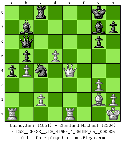 Last move : 0-1 2009 April 20 17:7:20 [Event "FICGS__CHESS__WCH_STAGE_1_GROUP_05__000006"] [Site "FICGS"] [Date "2009.02.03"] [Round "1"] [White "Laine,Jari"] [Black "Sharland,Michael"] [Result "0-1"] [WhiteElo "1861"] [BlackElo "2204"] 1.e4 c5 2.Nc3 Nc6 3.g3 g6 4.Bg2 d6 5.d3 Bg7 6.f4 e6 7.Nf3 Nge7 8.O-O O-O 9.Be3 b6 10.d4 Ba6 11.Re1 Rc8 12.Ne2 Na5 13.Bf2 cxd4 14.Bxd4 e5 15.Bc3 Nc4 16.Qd3 b5 17.fxe5 dxe5 18.Bb4 Qb6+ 19.Kh1 Rfd8 20.Qb3 Nc6 21.a3 Bb7 22.Nc3 a5 23.Nd5 Rxd5 24.exd5 Nxb4 25.axb4 a4 26.Qd3 f5 27.Nd2 Nxb2 28.Qe2 e4 29.Nxe4 fxe4 30.Qxe4 Nc4 0-1 Sicilian : Closed Kingside Castling by player White (move 8) Kingside Castling by player Black (move 8) Player Black won this chess game. Follow this game move after move (download)It began to feel as though you were playing against Chess itself. - On playing against Robert Fischer. (Walter Shipman) Um sich vor der Gefahr einer Erkältung zu schützen, sorge der wanderlustige König beizeiten für ein brauchbares Versteck. (Aaron Nimzowitsch) Desconfianza es la característica mas necesaria de un jugador de Ajedrez. (Siegbert Tarrasch) L'ordinateur a tué l'originalité. Il n'y a plus guère d'aventures sur l'échiquier. (Jacob Murray) Life is the sum of all your choices. (Albert Camus)