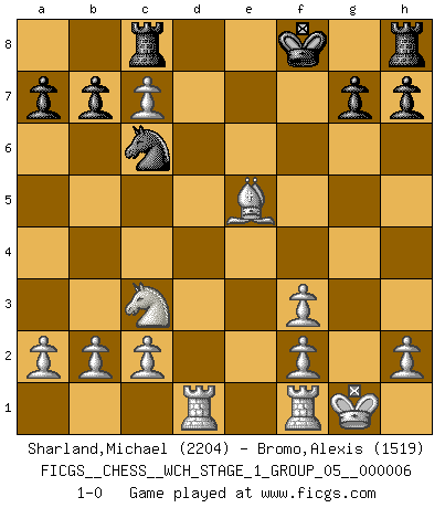Last move : 1-0 2009 February 20 6:14:19 [Event "FICGS__CHESS__WCH_STAGE_1_GROUP_05__000006"] [Site "FICGS"] [Date "2009.02.03"] [Round "1"] [White "Sharland,Michael"] [Black "Bromo,Alexis"] [Result "1-0"] [WhiteElo "2204"] [BlackElo "1519"] 1.e4 e5 2.Bc4 Nf6 3.d4 Nxe4 4.dxe5 Bc5 5.Bxf7+ Kxf7 6.Qd5+ Ke8 7.Qxe4 d5 8.exd6 Kf8 9.Qf3+ Qf6 10.dxc7 Nc6 11.Nc3 Qxf3 12.Nxf3 Bg4 13.O-O Bxf3 14.gxf3 Rc8 15.Bf4 Bd4 16.Rad1 Be5 17.Bxe5 1-0 Bishop's Opening : Ponziani gambit Kingside Castling by player White (move 13) Player White won this chess game. Follow this game move after move (download)Spassky will not be psyched out by Fischer. (Mike Goodall) Die Leute spielen gegen mich seit 15 Jahren unter Ihren Möglichkeiten. (Robert James Fischer) Si el ingenio solamente fuese necesario para lucirse, las mujeres serían las mejores jugadoras de Ajedrez del mundo. (Albin) J'ai toujours senti une vague pitié pour l'homme qui ne connaît rien aux échecs, tout comme j'en aurais pour un homme ignorant de l'amour. Les Echecs, comme la musique ou comme l'amour, ont le pouvoir de rendre heureux. (Siegbert Tarrasch) Vladimir Ras-Putin is still alive... He is also a good actor, I saw him in the Lord of the Rings. (Rodolfo d'Ettorre)