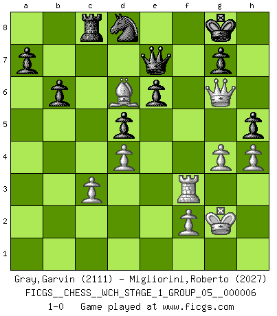 Last move : 1-0 2009 May 21 7:56:9 [Event "FICGS__CHESS__WCH_STAGE_1_GROUP_05__000006"] [Site "FICGS"] [Date "2009.02.03"] [Round "1"] [White "Gray,Garvin"] [Black "Migliorini,Roberto"] [Result "1-0"] [WhiteElo "2111"] [BlackElo "2027"] 1.d4 Nf6 2.c4 e6 3.Nc3 Bb4 4.e3 c5 5.Bd3 Nc6 6.Nge2 cxd4 7.exd4 d5 8.cxd5 Nxd5 9.O-O O-O 10.Nxd5 exd5 11.Be3 Bd6 12.Rc1 Qh4 13.g3 Qh5 14.Re1 Bg4 15.Qb3 Rab8 16.Nc3 Bf3 17.Be2 Bb4 18.Bxf3 Qxf3 19.Bf4 Rbd8 20.h3 Qh5 21.Kg2 Qf5 22.a3 Bxc3 23.bxc3 Qd7 24.Qb5 h6 25.a4 Rfe8 26.h4 b6 27.Rcd1 Re6 28.Rxe6 fxe6 29.Re1 Rc8 30.Qe2 Nd8 31.Qg4 Kh8 32.Re3 Qxa4 33.Rf3 Qe8 34.Be5 Qe7 35.Qg6 Kg8 36.g4 h5 37.Bd6 1-0 Nimzo-Indian : 4.e3 c5 Kingside Castling by player White (move 9) Kingside Castling by player Black (move 9) Player White won this chess game. Follow this game move after move (download)The tactician must know what to do whenever something needs doing; the strategist must know what to do when nothing needs doing. (Savielly Tartakover) Du musst nicht gut spielen, es reicht, wenn du besser spielst als dein Gegner. (Anonymous) Una buena memoria, concentración, imaginación y una fuerte voluntad, se requiere para llegar a ser un buen jugador. (Bobby Fischer) Les sacrifices démontrent seulement que quelqu'un a gaffé. (Savielly Tartacover) At work, the authority of a person is inversely proportional to the number of pens that person is carrying. (Dan Rotaru)