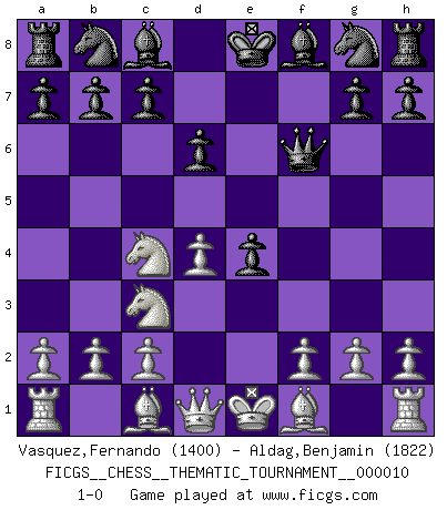 Last move : 1-0 2006 November 12 4:12:25 [Event "FICGS__CHESS__THEMATIC_TOURNAMENT__000010"] [Site "FICGS"] [Date "2006.08.28"] [Round "1"] [White "Vasquez,Fernando"] [Black "Aldag,Benjamin"] [Result "1-0"] [WhiteElo "1400"] [BlackElo "1822"] 1.e4 e5 2.Nf3 f5 3.Nxe5 Qf6 4.d4 d6 5.Nc4 fxe4 6.Nc3 1-0 Latvian counter-gambit Player White won this chess game. Follow this game move after move (download)We must make sure that Chess will not be like a dead language, very interesting, but for a very small group. (Sytze Faber) Wie ich sie so einen nach dem anderen nieder mähte wurde meine Überlegenheit offensichtlich. (José Raúl Capablanca) Con el tiempo, empecé a progresar en partidas decisivas. Tal vez porque me di cuenta de una simple verdad: no solo estaba yo nervioso sino también mi oponente. (Mikhail Tal) Aux échecs, les retours au sommet sont rares : les dommages psychologiques consécutifs à une défaite sont trop sévères. (Daily Telegraph) Every man's memory is his private literature. (Aldous Huxley)