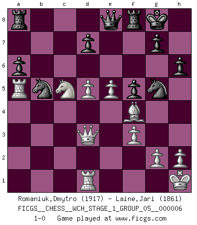 Last move : 1-0 2009 May 16 13:23:53 [Event "FICGS__CHESS__WCH_STAGE_1_GROUP_05__000006"] [Site "FICGS"] [Date "2009.02.03"] [Round "1"] [White "Romaniuk,Dmytro"] [Black "Laine,Jari"] [Result "1-0"] [WhiteElo "1917"] [BlackElo "1861"] 1.d4 Nf6 2.c4 e6 3.Nc3 Bb4 4.Qc2 O-O 5.a3 Bxc3+ 6.bxc3 c5 7.Nf3 b6 8.e4 Bb7 9.e5 Ne4 10.Bd3 f5 11.Bf4 Qe7 12.O-O Kh8 13.Rfd1 Qe8 14.Rab1 Na6 15.Ne1 Qg6 16.Be2 Kg8 17.Rd3 Qf7 18.f3 h6 19.R3d1 Ng5 20.a4 Qg6 21.Kh1 Rab8 22.a5 bxa5 23.Qa4 Qe8 24.Rb5 cxd4 25.cxd4 Nc7 26.Rc5 Na8 27.Rxa5 a6 28.Nd3 Nc7 29.Nc5 Bc6 30.Qa3 Ra8 31.d5 exd5 32.cxd5 Bb5 33.Bxb5 Nxb5 34.Qd3 1-0 Nimzo-Indian : Classical variation Kingside Castling by player Black (move 4) Kingside Castling by player White (move 12) Player White won this chess game. Follow this game move after move (download)During a Chess competition a Chessmaster should be a combination of a beast of prey and a monk. (Alexander Alekhine) Ich glaube, ich kenne inzwischen die Gründe für mein Versagen: schachliche Charakterfehler. Ich war nie ein Wunderkind und in meiner gesamten menschlichen Entwicklung immer zu langsam. (Viktor Kortschnoi) Si no le temes a Spassky, entonces elimino el elemento del dinero. (Jim Slater) Donnez-moi un Cavalier en 6e et je gagnerais toutes mes parties. (Steinitz) Fortune favours the audacious. (Desiderius Erasmus)
