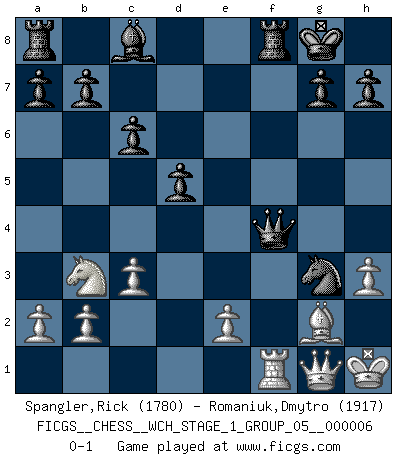 Last move : 0-1 2009 March 20 20:13:15 [Event "FICGS__CHESS__WCH_STAGE_1_GROUP_05__000006"] [Site "FICGS"] [Date "2009.02.03"] [Round "1"] [White "Spangler,Rick"] [Black "Romaniuk,Dmytro"] [Result "0-1"] [WhiteElo "1780"] [BlackElo "1917"] 1.d4 Nf6 2.c3 d5 3.Nf3 e6 4.Bg5 Be7 5.Ne5 Nbd7 6.f4 Ne4 7.Bxe7 Qxe7 8.g3 f6 9.Nd3 e5 10.dxe5 fxe5 11.Bg2 exf4 12.Nxf4 c6 13.O-O O-O 14.Nd2 Qc5+ 15.Kh1 Nf2+ 16.Rxf2 Qxf2 17.Nb3 Nf6 18.h3 Qxg3 19.Qf1 Nh5 20.Qg1 Qxf4 21.Rf1 Ng3+ 0-1 Queen's pawn game Kingside Castling by player White (move 13) Kingside Castling by player Black (move 13) Player Black won this chess game. Follow this game move after move (download)Only the player with the initiative has the right to attack. (Wilhelm Steinitz) Es ist im Leben wie im Schachspiel. Wir entwerfen einen Plan, dieser bleibt jedoch bedingt durch das, was im Schachspiel dem Gegner, im Leben dem Schicksal zu tun belieben wird. (Arthur Schopenhauer) La táctica fluye a partir de una posición superior. (Bobby Fischer) Les Echecs ont trois composantes : le temps, l'espace et le matériel en dernier. (Mikhail Tal) Is not life a hundred times too short to bore ourselves ? (Friedrich Nietzsche)