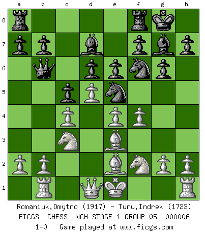 Last move : 1-0 2009 March 18 21:45:52 [Event "FICGS__CHESS__WCH_STAGE_1_GROUP_05__000006"] [Site "FICGS"] [Date "2009.02.03"] [Round "1"] [White "Romaniuk,Dmytro"] [Black "Turu,Indrek"] [Result "1-0"] [WhiteElo "1917"] [BlackElo "1723"] 1.d4 Nf6 2.c4 g6 3.Nc3 Bg7 4.e4 d6 5.f3 O-O 6.Be3 c5 7.d5 Nbd7 8.Nh3 Ne5 9.Nf2 Bd7 10.Be2 Qb6 11.Rb1 e6 12.f4 1-0 King's Indian : Saemisch, 5...O-O Kingside Castling by player Black (move 5) Player White won this chess game. Follow this game move after move (download)The game of Chess is not merely an idle amusement; several very valuable qualities of the mind are to be acquired and strengthened by it, so as to become habits ready on all occasions; for life is a kind of Chess. (Benjamin Franklin) Dass jemand wie Surab Asmaiparaschwili, der selbst Elopunkte gekauft hat , Vize-Präsident der Fide werden konnte, sagt schon einges über den Zustand dieser Organisation aus. (Joel Lautier) Una de estas pequeñas movidas modestas pudieran ser mas molestas a tu oponente que la amenaza mas grande. (Siegbert Tarrasch) Le système Elo représente seulement une moyenne. Il est simplement un indicateur de votre stabilité. (Anatoli Karpov) Excelling at chess has long been considered a symbol of more general intelligence. That is an incorrect assumption in my view, as pleasant as it might be. But for the purposes of argument and investigation, chess is, in Russkin-Gutman's words, 'an unparalleled laboratory, since both the learning process and the degree of ability obtained can be objectified and quantified, providing an excellent comparative framework on which to use rigorous analytical techniques.' (The Chess Master and the Computer, by Garry Kasparov - 2010)