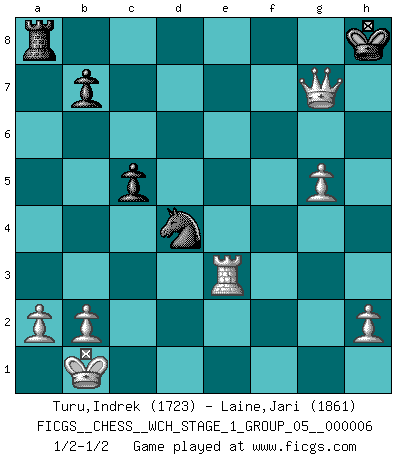 Last move : 1/2-1/2 2009 June 11 17:17:6 [Event "FICGS__CHESS__WCH_STAGE_1_GROUP_05__000006"] [Site "FICGS"] [Date "2009.02.03"] [Round "1"] [White "Turu,Indrek"] [Black "Laine,Jari"] [Result "1/2-1/2"] [WhiteElo "1723"] [BlackElo "1861"] 1.e4 e5 2.Nf3 d6 3.d4 exd4 4.Nxd4 g6 5.Nc3 Bg7 6.Be3 Nf6 7.Be2 O-O 8.Qd2 Re8 9.f3 d5 10.exd5 Nxd5 11.Nxd5 Qxd5 12.c4 Qd8 13.O-O-O c5 14.Nb5 Qb6 15.Rhe1 Bf5 16.g4 Bd7 17.Bg5 Rf8 18.Bh6 Bxb5 19.cxb5 Bxh6 20.Qxh6 Qf6 21.f4 a6 22.Kb1 axb5 23.Bxb5 Nc6 24.f5 Nd4 25.Bd3 Rfe8 26.g5 Rxe1 27.Rxe1 Qd8 28.fxg6 fxg6 29.Bxg6 hxg6 30.Qxg6+ Kh8 31.Qh6+ Kg8 32.Qg6+ Kh8 33.Re3 Qd7 34.Qf6+ Qg7 35.Qxg7+ 1/2-1/2 Philidor : Larsen variation Kingside Castling by player Black (move 7) Queenside Castling by player White (move 13) This chess game ended in a draw. Follow this game move after move (download)On the chessboard, lies and hypocrisy do not survive long. (Emanuel Lasker) Wir können eben der zündenden Macht des Opfers nicht wiederstehen, denn die Begeisterung für das Opfer liegt in der Natur des Menschen. (Rudolf Spielmann) Me gusta decir que Bobby Fischer fue el mejor jugador que jamás haya existido. Pero lo que hizo de Fischer un genio, fue su habilidad de mezclar una frescura y pragmatismo Americano con ideas Rusas acerca de la estrategia. (Bruce Pandolfini) Je crois qu'il existe des manières très spécifiques de jouer efficacement contre une machine. Evidemment, nous n'avons aucune chance en technique pure, parce que l'ordinateur calcule de manière parfaite. Mais lorsque nous faisons appel à notre cerveau, en utilisant l'intuition et la compréhension, alors nous restons beaucoup plus forts. (Anatoli Karpov) Inventor: A person who makes an ingenious arrangement of wheels, levers and springs, and believes it civilization. (Ambrose Bierce, The Devil's Dictionary)