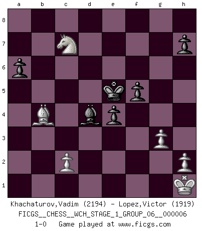 Last move : 1-0 2009 May 20 18:22:8 [Event "FICGS__CHESS__WCH_STAGE_1_GROUP_06__000006"] [Site "FICGS"] [Date "2009.02.03"] [Round "1"] [White "Khachaturov,Vadim"] [Black "Lopez,Victor"] [Result "1-0"] [WhiteElo "2194"] [BlackElo "1919"] 1.e4 c5 2.Nf3 e6 3.d4 cxd4 4.Nxd4 Nf6 5.Nc3 d6 6.Be2 a6 7.O-O Be7 8.f4 O-O 9.Kh1 Qc7 10.a4 b6 11.e5 dxe5 12.fxe5 Nfd7 13.Bf3 Bb7 14.Bxb7 Qxb7 15.Bf4 Nc6 16.Qf3 Rac8 17.Rad1 Nc5 18.Nxc6 Qxc6 19.Qxc6 Rxc6 20.b4 Nb7 21.Rd7 Bd8 22.Rf3 Rc7 23.Rxc7 Bxc7 24.Ne4 Rd8 25.g3 Rd4 26.Rc3 Bd8 27.Nf2 g5 28.Be3 Rxb4 29.Rc8 Rxa4 30.Rb8 Rc4 31.Rxb7 Kg7 32.Rb8 Bc7 33.Rc8 b5 34.Bxg5 Bxe5 35.Rxc4 bxc4 36.Ne4 Kg6 37.Bd2 Bd4 38.Bb4 e5 39.Nd6 f5 40.Nxc4 e4 41.Nd6 Kf6 42.Ne8+ Ke5 43.Nc7 1-0 This chess game has been lost on time (started : 2009.02.03 12:42:32) Sicilian : Anderssen variation Kingside Castling by player White (move 7) Kingside Castling by player Black (move 8) Player White won this chess game. Follow this game move after move (download)Some sacrifices are sound; the rest are mine. (Mikhail Tal) Im Hotelzimmer gab es nur zwei Schaben. (Über die Turnierbedingungen) (Peter Swidler) Uno no tiene que jugar muy bien, es suficiente jugar mejor que el oponente. (Siegbert Tarrasch) Il a essayé de se convaincre qu'il pourrait empêcher toutes les erreurs et ne jamais perdre. L'horreur ! Gary Kasparov au sujet de Robert Fischer. Yoga is 99% practice and 1% knowledge. (Sri Krishna Pattabhi Jois)