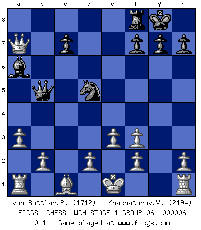 Last move : 0-1 2009 March 10 20:57:6 [Event "FICGS__CHESS__WCH_STAGE_1_GROUP_06__000006"] [Site "FICGS"] [Date "2009.02.03"] [Round "1"] [White "von Buttlar,Paul"] [Black "Khachaturov,Vadim"] [Result "0-1"] [WhiteElo "1712"] [BlackElo "2194"] 1.c4 e5 2.Nc3 Nf6 3.Nf3 Nc6 4.e3 Bb4 5.Qc2 Bxc3 6.Qxc3 Qe7 7.a3 d5 8.cxd5 Nxd5 9.Qc2 e4 10.Bb5 exf3 11.Bxc6+ bxc6 12.Qxc6+ Qd7 13.Qxa8 O-O 14.gxf3 Ba6 15.Qxa7 Qb5 0-1 English Opening Kingside Castling by player Black (move 13) Player Black won this chess game. Follow this game move after move (download)Bobby Fischer is the greatest Chess genius of all time ! (Alexander Kotov) Es ist besser die Steine des Gegners zu opfern. (Savielly Grigorievitsch Tartakower) El Ajedrez moderno está demasiado preocupado con cosas como la estructura de Peones. Olvidenlo, el Jaque Mate termina la partida. (Nigel Short) Les Echecs représentent une sphère d'idées créatrices basée sur la volonté des deux protagonistes. (Smyslov) A specialist learns more and more about less and less until he knows everything about nothing. (Nicholas Murray Butler)