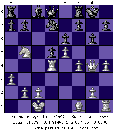 Last move : 1-0 2009 March 4 0:10:46 [Event "FICGS__CHESS__WCH_STAGE_1_GROUP_06__000006"] [Site "FICGS"] [Date "2009.02.03"] [Round "1"] [White "Khachaturov,Vadim"] [Black "Baars,Jan"] [Result "1-0"] [WhiteElo "2194"] [BlackElo "1555"] 1.e4 e6 2.d4 d5 3.Nc3 Nf6 4.e5 Nfd7 5.f4 c5 6.Nf3 Nc6 7.Be3 Qb6 8.Na4 Qa5+ 9.Nc3 Qb6 10.a3 cxd4 11.Nxd4 Nxd4 12.Bxd4 Qd8 13.Qg4 g6 14.O-O-O Bc5 15.Nb5 O-O 16.h4 Bxd4 17.Rxd4 1-0 French : Steinitz, Boleslavsky variation Queenside Castling by player White (move 14) Kingside Castling by player Black (move 15) Player White won this chess game. Follow this game move after move (download)Chess is above all, a fight ! (Emanuel Lasker) Das Schach ist nichts für kleine Geister, es beansprucht einen vollen Mann, der sich nicht sklavisch an das Überlieferte hält, sondern selbständig die Tiefen des Spiels zu ergründen sucht. (Wilhelm Steinitz) Realmente no sabemos como el juego fue inventado, aunque hay sospechas. Tan pronto como descubramos a los culpables, se los haremos saber. (Bruce Pandolfini) Même un GMI sait rarement calculer sur plus de cinq coups une attaque à sacrifices. (Rudolf Spielmann) For a mechanic, you seem to do an excessive amount of thinking. (C-3PO in Star Wars ep.2)