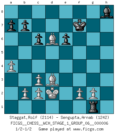 Last move : 1/2-1/2 2009 March 25 19:2:9 [Event "FICGS__CHESS__WCH_STAGE_1_GROUP_06__000006"] [Site "FICGS"] [Date "2009.02.03"] [Round "1"] [White "Staggat,Rolf"] [Black "Sengupta,Arnab"] [Result "1/2-1/2"] [WhiteElo "2114"] [BlackElo "1242"] 1.e4 e5 2.Nf3 Nf6 3.Nxe5 d6 4.Nf3 Nxe4 5.Nc3 Nxc3 6.dxc3 Be7 7.Bf4 O-O 8.Qd2 Nd7 9.O-O-O Nc5 10.h4 c6 11.h5 Re8 12.h6 Ne4 13.Qe3 Bf6 14.hxg7 Ng3 15.Rxd6 Rxe3 16.Rxd8+ Bxd8 17.Bxg3 Re8 18.Bd3 Bf6 19.Rxh7 Bxg7 20.Ng5 Re1+ 21.Kd2 Rg1 22.Rh2 Be6 23.Bh7+ Kf8 24.Bd6+ Ke8 25.Nxe6 fxe6 26.a4 Kf7 27.Bd3 Rh8 28.Rxh8 Bxh8 1/2-1/2 Petrov : Nimzovich attack Kingside Castling by player Black (move 7) Queenside Castling by player White (move 9) This chess game ended in a draw. Follow this game move after move (download)Chess opens and enriches your mind. (Saudin Robovic) Ich kämpfe solange mein Gegner einen Fehler machen kann. (Emanuel Lasker) Bobby Fischer es el jugador de Ajedrez mas grande que jamás haya existido. (Ken Smith) C'est une question de caractère, Beaucoup de gens perdent leur motivation très vite. D'autres, ils sont rares, peuvent la conserver très longtemps. J'aime les échecs, encore aujourd'hui je suis heureux d'analyser des parties. J'aime toujours gagner, je déteste encore perdre. Bien jouer est important pour mon intégrité intellectuelle et morale. Et puis les échecs vivent en ce moment une période historique grâce à Internet. Ils se développent dans les systèmes éducatifs à travers le monde. Ils sortent de leur ghetto, et c'est mon rôle de mener à bien cette révolution. (Gary Kasparov) Once you start thinking you have nothing left to learn, you have everything to learn. (Steve Badget)