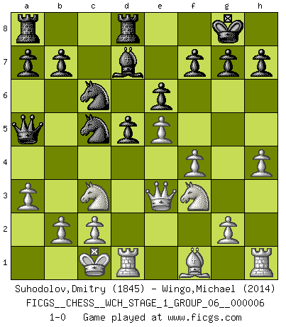 Last move : 1-0 2009 March 25 11:59:45 [Event "FICGS__CHESS__WCH_STAGE_1_GROUP_06__000006"] [Site "FICGS"] [Date "2009.02.03"] [Round "1"] [White "Suhodolov,Dmitry"] [Black "Wingo,Michael"] [Result "1-0"] [WhiteElo "1845"] [BlackElo "2014"] 1.e4 e6 2.d4 d5 3.Nc3 Nf6 4.e5 Nfd7 5.f4 c5 6.Nf3 Nc6 7.Be3 Be7 8.dxc5 O-O 9.Qd2 Bxc5 10.Bxc5 Nxc5 11.O-O-O Qa5 12.a3 Bd7 13.h4 Rfd8 14.Qe3 1-0 This chess game has been lost on time (started : 2009.02.03 12:42:32) French : Steinitz, Boleslavsky variation Kingside Castling by player Black (move 8) Queenside Castling by player White (move 11) Player White won this chess game. Follow this game move after move (download)Fischer Chess play was always razor-sharp, rational and brilliant. One of the best ever. (Dave Regis) Der Bart als Geschlechtszeichen mitten im Gesicht ist obszön. Daher gefällt er den Weibern. [Zugegeben, kein Schachzitat, aber unglaublich originell] (Arthur Schopenhauer) El juego de Damas es para vagabundos. (Paul Morphy) Tous ces prétendus hommes politiques sont les pions, les Cavaliers, les Tours ou les Fous d'une partie d'échecs qui se jouera tant qu'un hasard ne renversera pas l'échiquier. (Honoré de Balzac) Before all elsed, be armed. (Niccolo Machiavelli)