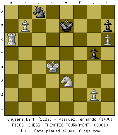 Last move : 1-0 2007 April 22 7:19:3 [Event "FICGS__CHESS__THEMATIC_TOURNAMENT__000010"] [Site "FICGS"] [Date "2006.08.28"] [Round "1"] [White "Ghysens,Dirk"] [Black "Vasquez,Fernando"] [Result "1-0"] [WhiteElo "2187"] [BlackElo "1400"] 1.e4 e5 2.Nf3 f5 3.Nxe5 Qf6 4.Nc4 fxe4 5.Nc3 Qg6 6.d3 Bb4 7.Bd2 Nf6 8.Nxe4 Bxd2+ 9.Qxd2 O-O 10.Ne3 d6 11.O-O-O Be6 12.Nc3 Qf7 13.d4 c6 14.h4 Nbd7 15.Bd3 Rae8 16.h5 b5 17.f3 Nb6 18.h6 g6 19.b3 a5 20.Ne4 Nxe4 21.fxe4 b4 22.Rdf1 Qe7 23.c4 bxc3 24.Qxc3 a4 25.Bc2 Rc8 26.bxa4 d5 27.a5 Nd7 28.Rxf8+ Qxf8 29.Kb2 dxe4 30.Bb3 Bxb3 31.axb3 Qf2+ 32.Kb1 Qf8 33.Qc4+ Kh8 34.a6 Rb8 35.Qc3 Qf7 36.Kb2 Qf2+ 37.Nc2 Qf6 38.a7 Ra8 39.Ra1 c5 40.dxc5 Qxc3+ 41.Kxc3 Nxc5 42.Ne3 Kg8 43.Nd5 Kf7 44.Nb6 Rd8 45.a8Q Rxa8 46.Rxa8 g5 47.b4 Ne6 48.Nd5 e3 49.Nxe3 Kf6 50.b5 Nc5 51.Ra7 Ne4+ 52.Kd4 Nd6 53.b6 Nc8 54.Ra6 Ke7 55.b7 1-0 Latvian counter-gambit Kingside Castling by player Black (move 9) Queenside Castling by player White (move 11) Promotion Queen by player White (move 45) 10 pieces endgame at move 49 : White KRNPPP , Black KNPP WHITE : King + 1 Rook 1 Knight 3 Pawns BLACK : King + 1 Knight 2 Pawns Player White won this chess game. Follow this game move after move (download)Nowadays, when you're not a grandmaster at 14, you can forget about it. (Anand Viswanathan) Das Schach ist nichts für kleine Geister, es beansprucht einen vollen Mann, der sich nicht sklavisch an das Überlieferte hält, sondern selbständig die Tiefen des Spiels zu ergründen sucht. (Wilhelm Steinitz) Yo siempre he tenido un ligero sentimiento de lástima por una persona que no tiene conocimiento del Ajedrez. (Siegbert Tarrasch) Même un GMI sait rarement calculer sur plus de cinq coups une attaque à sacrifices. (Rudolf Spielmann) Luck never made a man wise. (Seneca, Letters to Lucilius)