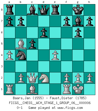 Last move : 0-1 2009 February 27 15:36:36 [Event "FICGS__CHESS__WCH_STAGE_1_GROUP_06__000006"] [Site "FICGS"] [Date "2009.02.03"] [Round "1"] [White "Baars,Jan"] [Black "Faust,Dieter"] [Result "0-1"] [WhiteElo "1555"] [BlackElo "1785"] 1.d4 Nf6 2.c4 c5 3.d5 e6 4.Nc3 exd5 5.cxd5 d6 6.e4 g6 7.Nf3 Bg7 8.Be2 O-O 9.O-O Re8 10.Qc2 Na6 11.Nd2 Nc7 12.a4 Nfxd5 13.Nxd5 Nxd5 14.Bb5 Nb4 0-1 Benoni : Classical with e4 and Nf3 Kingside Castling by player Black (move 8) Kingside Castling by player White (move 9) Player Black won this chess game. Follow this game move after move (download)If I win a tournament, I win it by myself. I do the playing. Nobody helps me. (Bobby Fischer) Wenn ich einen Club besuche, sind die Spieler stumm vor Staunen. (José Raúl Capablanca) Cuando le juegas a Fischer, no es una cuestion de si vas a ganar o perder. Es una cuestion de si vas a sobrevivir. (Boris Spassky) En blitz, le Cavalier l'emporte sur le Fou. (Vlastimil Hort) To steal ideas from one person is plagiarism. To steal from many is research. (Unknown)