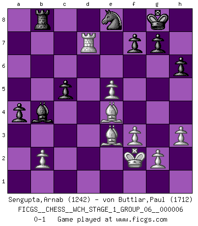 Last move : 0-1 2009 May 10 17:29:36 [Event "FICGS__CHESS__WCH_STAGE_1_GROUP_06__000006"] [Site "FICGS"] [Date "2009.02.03"] [Round "1"] [White "Sengupta,Arnab"] [Black "von Buttlar,Paul"] [Result "0-1"] [WhiteElo "1242"] [BlackElo "1712"] 1.d4 Nf6 2.Nf3 d5 3.c4 c6 4.Nc3 e6 5.e3 Bd6 6.Bd3 dxc4 7.Bxc4 b5 8.Bd3 b4 9.Ne2 Nbd7 10.Qc2 Bb7 11.e4 e5 12.O-O O-O 13.a3 Qe7 14.axb4 Bxb4 15.Rd1 a5 16.dxe5 Nxe5 17.Nxe5 Qxe5 18.Bf4 Qc5 19.Ng3 Qxc2 20.Bxc2 Rad8 21.Bg5 h6 22.Bf4 Rfe8 23.f3 Ba6 24.Nf5 Nh5 25.Be3 Rxd1+ 26.Rxd1 Bc8 27.Nd6 Rd8 28.Nxc8 Rxc8 29.Kf2 Nf6 30.h3 c5 31.e5 Ne8 32.Bf5 Ra8 33.Rd7 a4 34.Be4 Rb8 0-1 This chess game has been lost on time (started : 2009.02.03 12:42:32) Queen's pawn game Kingside Castling by player White (move 12) Kingside Castling by player Black (move 12) Player Black won this chess game. Follow this game move after move (download)To avoid losing a piece, many a person has lost the game. (Savielly Tartakover) Ich tröste mich mit dem Vergnügen, daß Schachfans, Zuschauer und Leser glücklich sind, wenn ein Großmeister etwas riskiert, statt nur Klötzchen zu schieben. (Mikhail Nekhemyevich Tal) Muchos se han convertido en Maestros de Ajedrez, nadie se ha convertido en el Maestro del Ajedrez. (Siegbert Tarrasch) C'est une question de caractère, Beaucoup de gens perdent leur motivation très vite. D'autres, ils sont rares, peuvent la conserver très longtemps. J'aime les échecs, encore aujourd'hui je suis heureux d'analyser des parties. J'aime toujours gagner, je déteste encore perdre. Bien jouer est important pour mon intégrité intellectuelle et morale. Et puis les échecs vivent en ce moment une période historique grâce à Internet. Ils se développent dans les systèmes éducatifs à travers le monde. Ils sortent de leur ghetto, et c'est mon rôle de mener à bien cette révolution. (Gary Kasparov) They say poker is a zero-sum game. It must be, because every time I play my sum ends up zero. (Max Shapiro)