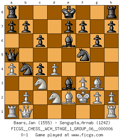 Last move : 0-1 2009 February 23 12:14:55 [Event "FICGS__CHESS__WCH_STAGE_1_GROUP_06__000006"] [Site "FICGS"] [Date "2009.02.03"] [Round "1"] [White "Baars,Jan"] [Black "Sengupta,Arnab"] [Result "0-1"] [WhiteElo "1555"] [BlackElo "1242"] 1.d4 d5 2.c4 c6 3.Nf3 Nf6 4.Bg5 dxc4 5.a4 Na6 6.e3 Ne4 7.Bh4 Qa5+ 8.Nfd2 Be6 9.f3 Nd6 10.Nc3 Nb4 11.Qb1 g6 12.Be2 Bh6 13.Kf2 Nf5 14.Bg3 Bxe3+ 0-1 QGD Slav : 3.Nf3 Player Black won this chess game. Follow this game move after move (download)I prefer to lose a really good game than to win a bad one. (David Levy) Charakterschwächen offenbaren sich normalerweise während einer Schachpartie. (Garry Kasparov) Debes de llevar a tu oponente hacia un profundo y obscuro bosque donde 2+2=5, y el camino que conduce a la salida es suficientemente ancho para solamente uno. (Mikhail Tal) Mon pion favori sur ma case favorite ! Bronstein en parlant d'un coup de pion en h5 quand il avait les Noirs. The Internet isn't free. It just has an economy that makes no sense to capitalism. (Brad Shapcott)
