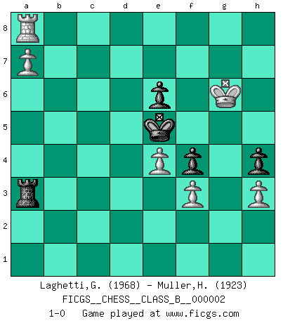 Last move : 1-0 2006 November 13 16:20:5 [Event "FICGS__CHESS__CLASS_B__000002"] [Site "FICGS"] [Date "2006.04.16"] [Round "1"] [White "Laghetti,Gaetano"] [Black "Muller,Henri-Louis"] [Result "1-0"] [WhiteElo "1968"] [BlackElo "1923"] 1.d4 Nf6 2.c4 e6 3.Nc3 d5 4.Nf3 Nbd7 5.Bg5 c6 6.e3 Qa5 7.Nd2 Bb4 8.Qc2 O-O 9.Be2 dxc4 10.Bxf6 Nxf6 11.Nxc4 Qc7 12.O-O b6 13.Ne4 Nxe4 14.Qxe4 Bb7 15.Bf3 Rac8 16.Rac1 Rfd8 17.Rfd1 Be7 18.Ne5 Bd6 19.h3 Bxe5 20.Qxe5 Qe7 21.a3 f6 22.Qe4 Rd7 23.Qd3 c5 24.Bxb7 Rxb7 25.b4 Rbc7 26.dxc5 bxc5 27.bxc5 h6 28.Qd6 Kf7 29.c6 Qxd6 30.Rxd6 a6 31.Rc4 Ke7 32.Rcd4 f5 33.g4 Rxc6 34.Rd7+ Kf8 35.Ra7 R8c7 36.Ra8+ Ke7 37.Ra4 Rc4 38.R8xa6 Rxa4 39.Rxa4 Rc1+ 40.Kg2 Kf6 41.Ra6 g6 42.a4 Ra1 43.a5 Ra4 44.gxf5 gxf5 45.Kf3 h5 46.Ra8 Kg5 47.Kg3 h4+ 48.Kg2 Ra2 49.a6 Kf6 50.Kf3 Ra4 51.Ke2 Ke5 52.Kd3 Kd5 53.a7 Ra3+ 54.Ke2 Ra2+ 55.Kf3 Ke5 56.Kg2 Ra1 57.f3 Ra2+ 58.Kf1 Ra1+ 59.Ke2 Ra2+ 60.Kd3 Ra3+ 61.Kc4 Ra5 62.Kb4 Ra1 63.Kb5 Ra3 64.Kc6 Ra1 65.Kd7 Ra3 66.Ke7 Ra6 67.Kf7 f4 68.e4 Ra3 69.Kg6 1-0 Queen's pawn game Kingside Castling by player Black (move 8) Kingside Castling by player White (move 12) Player White won this chess game. Follow this game move after move (download)I'd rather have a Pawn than a finger. (Reuben Fine) Das Schach ist nichts für kleine Geister, es beansprucht einen vollen Mann, der sich nicht sklavisch an das Überlieferte hält, sondern selbständig die Tiefen des Spiels zu ergründen sucht. (Wilhelm Steinitz) El Ajedrez es un juego terrible. Si no dominas el centro, tu oponente tiene una posición mas libre. Si tu tienes el centro, entonces realmente tienes algo de que preocuparte. (Siegbert Tarrasch) Je menace de comprendre la position. (Anonyme) Perhaps the current trend of many chess professionals taking up the more lucrative pastime of poker is not a wholly negative one. It may not be too late for humans to relearn how to take risks in order to innovate and thereby maintain the advanced lifestyles we enjoy. And if it takes a poker-playing supercomputer to remind us that we can't enjoy the rewards without taking the risks, so be it. (The Chess Master and the Computer, by Garry Kasparov - 2010)