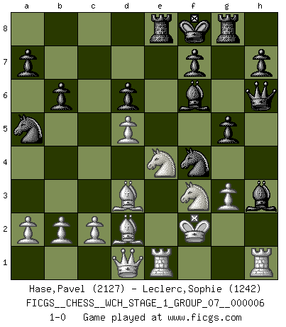 Last move : 1-0 2009 March 15 2:13:40 [Event "FICGS__CHESS__WCH_STAGE_1_GROUP_07__000006"] [Site "FICGS"] [Date "2009.02.03"] [Round "1"] [White "Hase,Pavel"] [Black "Leclerc,Sophie"] [Result "1-0"] [WhiteElo "2127"] [BlackElo "1242"] 1.e4 e5 2.f4 exf4 3.Bc4 Nc6 4.d4 Qh4+ 5.Kf1 Nf6 6.Nf3 Qh6 7.Nc3 Be7 8.e5 Nh5 9.Rg1 g5 10.d5 Na5 11.Bd3 b6 12.g4 fxg3 13.hxg3 d6 14.exd6 cxd6 15.Qe2 Rg8 16.Bd2 Kf8 17.Re1 Bf6 18.Ne4 Bh3+ 19.Kf2 Re8 20.Rh1 Nf4 21.Qd1 1-0 KGA : Bishop's gambit, Maurian defense Player White won this chess game. Follow this game move after move (download)Chess teaches you to control the initial excitement you feel when you see something that looks good and it trains you to think objectively when you're in trouble. (Stanley Kubrick) Als er Schachweltmeister wurde ließ er praktisch alle stärksten Sovietspieler für sich arbeiten. Wenn ein auch nur mittelmässiger Meister ein Spezialist für eine bestimmte Eröffnung war, wurde er von Karpov gerufen. Das wurde alles geheim gehalten. (Mikhail Moiseyevich Botvinik) Me siento como si fuera una pieza en una partida de Ajedrez, cuando mi oponente me indica: esa pieza no puede ser movida. (Soren Kierkegaard) J'ai vu le vaincu d'Echecs jouer des années durant dans l'espoir de la fête de la victoire. Car tu es plus riche de ce qu'elle existe si même elle n'est point pour toi. Ainsi de la perle du fond des mers. (Antoine de Saint-Exupéry) I don't diet. I just don't eat as much as I'd like to. (Linda Evangelista, supermodel)