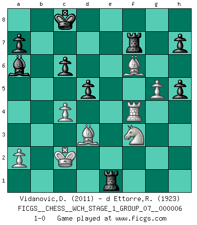 Last move : 1-0 2009 April 11 2:31:8 [Event "FICGS__CHESS__WCH_STAGE_1_GROUP_07__000006"] [Site "FICGS"] [Date "2009.02.03"] [Round "1"] [White "Vidanovic,Djordje"] [Black "d Ettorre,Rodolfo"] [Result "1-0"] [WhiteElo "2011"] [BlackElo "1923"] 1.e4 e5 2.Nf3 Nc6 3.d4 exd4 4.Nxd4 Nf6 5.Nxc6 bxc6 6.e5 Qe7 7.Qe2 Nd5 8.c4 Ba6 9.b3 g6 10.f4 Bg7 11.Qf2 Nb6 12.Ba3 Qe6 13.c5 Bxe5 14.fxe5 Qxe5+ 15.Kd1 Qxa1 16.Kc1 Nc4 17.bxc4 O-O-O 18.Bb4 Qg7 19.Bc3 Qh6+ 20.Nd2 Rhf8 21.Bd3 Rde8 22.Kc2 Qe3 23.Qxe3 Rxe3 24.Rf1 f5 25.g4 f4 26.Bg7 Rf7 27.Bd4 R3e7 28.g5 Re6 29.h4 d5 30.cxd6 cxd6 31.Bf6 d5 32.Rxf4 Re1 33.h5 gxh5 34.Nf3 1-0 Scotch : Mieses variation Queenside Castling by player Black (move 17) Player White won this chess game. Follow this game move after move (download)The passed Pawn is a criminal, who should be kept under lock and key. Mild measures, such as police surveillance, are not sufficient. (Aaron Nimzovich) Stelle das Brett so, daß die Sonne in die Augen deines Gegners scheint. (Ruy López) El Ajedrez hace al hombre ser mas sabio y ver mas claro. (Vladimir Putin) On a dit que l'homme se distingue de l'animal par le fait qu'il achète plus de livres qu'il ne peut en lire. Je voudrais suggérer qu'inclure à la liste des livres quelques livres d'échecs rendrait la distinction manifeste. (Edward Lasker) Always remember that you are unique; just like everyone else. (Unknown)