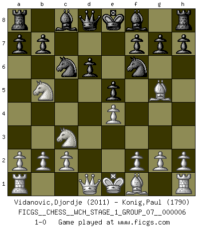 Last move : 1-0 2009 March 15 20:39:31 [Event "FICGS__CHESS__WCH_STAGE_1_GROUP_07__000006"] [Site "FICGS"] [Date "2009.02.03"] [Round "1"] [White "Vidanovic,Djordje"] [Black "Konig,Paul"] [Result "1-0"] [WhiteElo "2011"] [BlackElo "1790"] 1.e4 c5 2.Nf3 Nc6 3.d4 cxd4 4.Nxd4 Nf6 5.Nc3 e5 6.Ndb5 d6 7.Bg5 1-0 Sicilian : Pelikan (Lasker/Sveshnikov) variation Player White won this chess game. Follow this game move after move (download)You can only get good at Chess if you love the game. (Bobby Fischer) Als ich elf wurde, wurde ich einfach gut. (Robert James Fischer) El Ajedrez demanda una total concentración. (Bobby Fischer) Comme les marins qui ont mille raisons différentes d'aller en mer, les joueurs d'échecs en ont tout autant avant de s'installer devant une table et jouer... (Vincent Bertignac, philosophe) There is far too much law for those who can afford it and far too little for those who cannot. (Derek Bok)