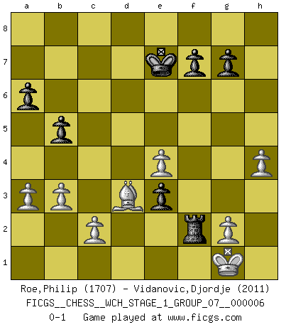 Last move : 0-1 2009 April 20 17:24:32 [Event "FICGS__CHESS__WCH_STAGE_1_GROUP_07__000006"] [Site "FICGS"] [Date "2009.02.03"] [Round "1"] [White "Roe,Philip"] [Black "Vidanovic,Djordje"] [Result "0-1"] [WhiteElo "1707"] [BlackElo "2011"] 1.e4 c5 2.Nf3 d6 3.d4 cxd4 4.Nxd4 Nf6 5.Nc3 a6 6.f4 e6 7.Qf3 e5 8.fxe5 dxe5 9.Nf5 Nc6 10.Bg5 Bxf5 11.Qxf5 Bb4 12.Bd3 Qd4 13.Bd2 Bxc3 14.Bxc3 Qe3+ 15.Kf1 O-O 16.h4 Qb6 17.Rh3 h5 18.Qf2 Nd4 19.Bxd4 exd4 20.b3 Ng4 21.Qf4 Rae8 22.Kg1 Re6 23.Rf3 Qc5 24.Raf1 Ne3 25.R1f2 b5 26.Rg3 Ng4 27.Rxg4 hxg4 28.Qxg4 Rfe8 29.Qf5 Qc7 30.Qg5 Re5 31.Qg4 R8e6 32.Rf5 Rxf5 33.Qxf5 Qg3 34.Qf2 Rg6 35.Be2 Qe3 36.Qxe3 dxe3 37.Kf1 Rf6+ 38.Bf3 Rc6 39.Bd1 Rd6 40.Be2 Rd2 41.Bd3 Rf2+ 42.Kg1 Kf8 43.a3 Ke7 0-1 Sicilian : Najdorf, 6.f4 Kingside Castling by player Black (move 15) Player Black won this chess game. Follow this game move after move (download)The stomach is an essential part of the Chess master. (Bent Larsen) Drei Punkte vor allen anderen ist wie einer, der im weißen Anzug posiert, während der Rest in Müllsäcke gekleidet dasteht. (Viktor Kortschnoi) Hoy en día, si tu no eres un Gran Maestro a los 14 años, es mejor que lo olvides. (Anand Viswanathan) C'est une question de caractère, Beaucoup de gens perdent leur motivation très vite. D'autres, ils sont rares, peuvent la conserver très longtemps. J'aime les échecs, encore aujourd'hui je suis heureux d'analyser des parties. J'aime toujours gagner, je déteste encore perdre. Bien jouer est important pour mon intégrité intellectuelle et morale. Et puis les échecs vivent en ce moment une période historique grâce à Internet. Ils se développent dans les systèmes éducatifs à travers le monde. Ils sortent de leur ghetto, et c'est mon rôle de mener à bien cette révolution. (Gary Kasparov) Life is pleasant. Death is peaceful. It's the transition that's troublesome. (Isaac Asimov)