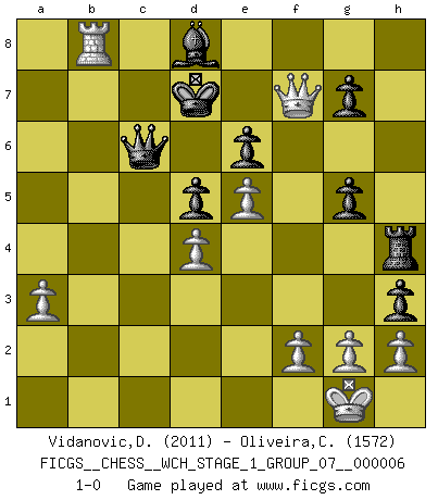 Last move : 1-0 2009 May 1 18:41:27 [Event "FICGS__CHESS__WCH_STAGE_1_GROUP_07__000006"] [Site "FICGS"] [Date "2009.02.03"] [Round "1"] [White "Vidanovic,Djordje"] [Black "Oliveira,Carlos"] [Result "1-0"] [WhiteElo "2011"] [BlackElo "1572"] 1.e4 c6 2.c3 d5 3.e5 Bf5 4.d4 e6 5.Bd3 Bxd3 6.Qxd3 Nd7 7.Ne2 Ne7 8.O-O c5 9.Nd2 Nc6 10.Qg3 cxd4 11.cxd4 Ne7 12.Nb3 Nf5 13.Qd3 Rc8 14.Ng3 Nxg3 15.Qxg3 Nb8 16.Bd2 Nc6 17.Rfc1 Qb6 18.Rc3 h6 19.Rac1 Qb5 20.R3c2 Rd8 21.a3 a5 22.Qc3 a4 23.Na5 Rc8 24.Qg3 h5 25.Qg5 Rh7 26.Qe3 h4 27.b3 axb3 28.Rb2 h3 29.Rxb3 Qa6 30.Rxb7 Be7 31.Qb3 Bd8 32.Nxc6 Rxc6 33.Rxc6 Qxc6 34.Rb8 Rh4 35.Bg5 f6 36.Qb1 fxg5 37.Qg6+ Kd7 38.Qf7+ 1-0 Caro-Kann defense Kingside Castling by player White (move 8) Player White won this chess game. Follow this game move after move (download)Robert Fischer is a law unto himself. (Larry Evans) Ein bischen Romantik kann weder im Schach noch in der Liebe schaden. Also versuche ich mich ab und zu daran zu erinnern. (Nigel Short) Aquellos que dicen entender al Ajedrez, no entienden nada. (Robert Hubner) Si je n'étais pas joueur d'échecs, je serais le meilleur dans quelque chose d'autre. (Anatoli Karpov) Internet: Absolute communication, absolute isolation. (Paul Carvel)
