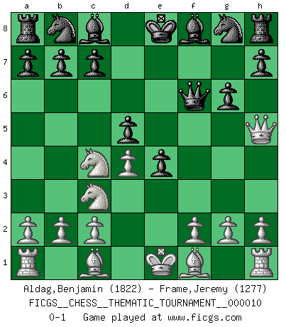 Last move : 0-1 2006 November 14 4:57:19 [Event "FICGS__CHESS__THEMATIC_TOURNAMENT__000010"] [Site "FICGS"] [Date "2006.08.28"] [Round "1"] [White "Aldag,Benjamin"] [Black "Frame,Jeremy"] [Result "0-1"] [WhiteElo "1822"] [BlackElo "1277"] 1.e4 e5 2.Nf3 f5 3.Nxe5 Qf6 4.d4 d6 5.Nc4 fxe4 6.Nc3 d5 7.Qh5+ g6 0-1 This chess game has been lost on time (started : 2006.08.28 7:7:15) Latvian counter-gambit Player Black won this chess game. Follow this game move after move (download)There are two types of sacrifices: correct ones and mine. (Mikhail Tal) Wie bekannt hörte Morphy 1859 auf, Schach zu spielen. Seine Enttäuschung galt nicht so sehr dem Schach, wie den Schachspielern. (Robert James Fischer) La pasion por jugar al Ajedrez es una de las mas inexplicables en el mundo. (H.G. Wells) Je fais ceci parce que dans cinquante coups j'obtiendrai cela; je m'appelle Mikhail Moisevitch Botvinnik. (Botvinnik) Experiences are the keys to life. (Daniel Parmet)