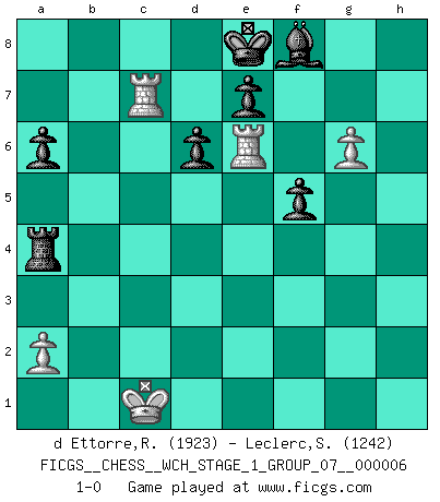 Last move : 1-0 2009 May 18 19:18:45 [Event "FICGS__CHESS__WCH_STAGE_1_GROUP_07__000006"] [Site "FICGS"] [Date "2009.02.03"] [Round "1"] [White "d Ettorre,Rodolfo"] [Black "Leclerc,Sophie"] [Result "1-0"] [WhiteElo "1923"] [BlackElo "1242"] 1.e4 c5 2.Nf3 d6 3.d4 cxd4 4.Nxd4 Nf6 5.Nc3 g6 6.Be3 Bg7 7.f3 O-O 8.Qd2 Nc6 9.Bc4 Ne5 10.Bb3 Bd7 11.O-O-O Rc8 12.Kb1 Nc4 13.Bxc4 Rxc4 14.g4 b5 15.b3 b4 16.bxc4 bxc3 17.Qxc3 Qc7 18.g5 Nh5 19.Kc1 Rc8 20.Rhf1 Qb7 21.Qa5 Rxc4 22.Qd8+ Bf8 23.Nb3 Ba4 24.Kb2 Ng7 25.Qa5 Ne6 26.Kb1 a6 27.Bc1 Nd4 28.Qd5 Qxd5 29.exd5 Nxc2 30.Rf2 Nb4 31.Ba3 Bg7 32.Bxb4 Rxb4 33.Re1 Rb7 34.Kc1 h6 35.h4 Kf8 36.Rc2 f5 37.f4 Kf7 38.Re3 Rb4 39.Rc7 Bf8 40.Re6 hxg5 41.hxg5 Ke8 42.Na5 Rb5 43.Nc4 Rxd5 44.Rxg6 Rd4 45.Nb6 Rxf4 46.Re6 Rb4 47.Nxa4 Rxa4 48.g6 1-0 Sicilian : Dragon, Yugoslav attack, 7...O-O Kingside Castling by player Black (move 7) Queenside Castling by player White (move 11) Player White won this chess game. Follow this game move after move (download)I'm not a materialistic person, in that, I don't suffer the lack or loss of money. The absence of worldly goods I don't look back on. For Chess is a way I can be as materialistic as I want without having to sell my soul. (Jamie Walter Adams) Wenn ich einen Club besuche, sind die Spieler stumm vor Staunen. (José Raúl Capablanca) Nos gusta pensar. (Gary Kasparov) D'abord les bases : Jouez et étudiez, puis étudiez et jouez, ensuite jouez et étudiez, puis étudiez et jouez. Deuxièmement : Donnez toujours le meilleur de vous-même ! (Ken Smith) Don't be irreplaceable, if you can't be replaced, you can't be promoted. (Dan Rotaru)