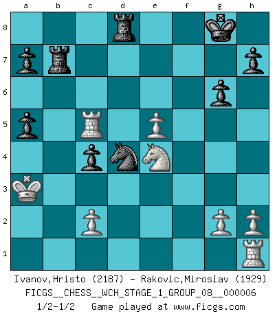 Last move : 1/2-1/2 2009 February 26 1:31:19 [Event "FICGS__CHESS__WCH_STAGE_1_GROUP_08__000006"] [Site "FICGS"] [Date "2009.02.03"] [Round "1"] [White "Ivanov,Hristo"] [Black "Rakovic,Miroslav"] [Result "1/2-1/2"] [WhiteElo "2187"] [BlackElo "1929"] 1.e4 e6 2.d4 d5 3.Nc3 Bb4 4.e5 c5 5.a3 Bxc3+ 6.bxc3 Ne7 7.Qg4 O-O 8.Bd3 f5 9.exf6 Rxf6 10.Bg5 Rf7 11.Qh5 g6 12.Qd1 e5 13.dxe5 Nbc6 14.f4 c4 15.Be2 Qb6 16.Rb1 Qc5 17.Bxe7 Nxe7 18.Qd4 Qxd4 19.cxd4 Rxf4 20.Bf3 b6 21.Ne2 Rf7 22.a4 Bf5 23.Kd2 Raf8 24.Nc3 Be6 25.a5 bxa5 26.Rb5 Nf5 27.Bxd5 Nxd4 28.Bxe6 Nxe6 29.Ne4 Rd8+ 30.Kc3 Nd4 31.Rc5 Ne2+ 32.Kb2 Rb7+ 33.Ka3 Nd4 1/2-1/2 French : Winawer, Advance, poisoned pawn variation Kingside Castling by player Black (move 7) This chess game ended in a draw. Follow this game move after move (download)Chess is like war on a board. (Bobby Fischer) Du kannst im Schach nur gut werden, wenn du das Spiel liebst. (Robert James Fischer) El ganar no lo es todo... pero el perder es nada. (Mednis) Il n'y a pas eu de défaite parce que je ne crois pas que cet ordinateur ait jamais existé. IBM a triché en refusant d'imprimer les modes de recherche de la machine. C'est évident, pendant le match, des coups décisifs ont été joués par des êtres humains. Aujourd'hui, les meilleurs spécialistes en informatique ne peuvent toujours pas expliquer comment Deep-Blue a pu jouer contre la logique des ordinateurs. IBM a gagné une guerre de communication, mais ils sont incapables de prouver que l'ordinateur a gagné tout seul. (Garry Kasparov) Bobby never cared about money, though. His only desire was to prove that his choices were correct: He wanted chess to be important because he was a chess player, and he wanted to be important. Bobby knew money was important, but he didn't have a clue why, outside of clothes and status. The only way he could accomplish what he wanted was to fight for a lot of money. Once he got it, he gave it away. He did not know how to spend it. And once he'd become champion, after, essentially, sacrificing his life for it, he didn't know how to spend his time. (Bob Wade)