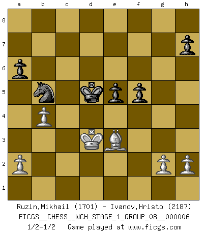 Last move : 1/2-1/2 2009 June 2 10:11:21 [Event "FICGS__CHESS__WCH_STAGE_1_GROUP_08__000006"] [Site "FICGS"] [Date "2009.02.03"] [Round "1"] [White "Ruzin,Mikhail"] [Black "Ivanov,Hristo"] [Result "1/2-1/2"] [WhiteElo "1701"] [BlackElo "2187"] 1.e4 c5 2.Nf3 Nc6 3.d4 cxd4 4.Nxd4 Nf6 5.Nc3 e5 6.Ndb5 d6 7.Bg5 a6 8.Na3 b5 9.Nd5 Be7 10.Nxe7 Nxe7 11.f3 d5 12.exd5 Nfxd5 13.c4 bxc4 14.Bxc4 f6 15.Bd2 Be6 16.Qa4+ Kf7 17.Bb3 Re8 18.O-O Kg8 19.Ba5 Qb8 20.Rfd1 Qb7 21.Rac1 Rec8 22.Rxc8+ Qxc8 23.Be1 Rb8 24.Qe4 Nf4 25.Bxe6+ Nxe6 26.Nc4 Nd4 27.b3 Qc6 28.Kf1 Qxe4 29.fxe4 Kf7 30.Kf2 Ke6 31.Bc3 Nec6 32.Rc1 Nb5 33.Bd2 g6 34.Na5 Ncd4 35.Nc6 Rb6 36.Nxd4+ Nxd4 37.Rc7 Rc6 38.Rxc6+ Nxc6 39.b4 f5 40.Ke3 Na7 41.Kd3 Nb5 42.exf5+ gxf5 43.Be3 Kd5 1/2-1/2 Sicilian : Pelikan (Lasker/Sveshnikov) variation Kingside Castling by player White (move 18) This chess game ended in a draw. Follow this game move after move (download)The essence of Chess is thinking about what Chess is. (David Bronstein) Ich habe Kasparov in Rente geschickt. (Veselin Topalov) Dios mío, Bobby Fischer juega tan simple. (Alexei Suetin) On est toujours la mazette de quelqu'un d'autre. (Anonyme) Patience, use the Force, think ! (Obi-Wan Kenobi in Star Wars ep.2)