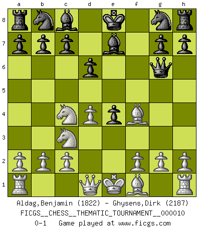 Last move : 0-1 2006 November 12 22:26:1 [Event "FICGS__CHESS__THEMATIC_TOURNAMENT__000010"] [Site "FICGS"] [Date "2006.08.28"] [Round "1"] [White "Aldag,Benjamin"] [Black "Ghysens,Dirk"] [Result "0-1"] [WhiteElo "1822"] [BlackElo "2187"] 1.e4 e5 2.Nf3 f5 3.Nxe5 Qf6 4.d4 d6 5.Nc4 fxe4 6.Nc3 Qg6 7.Bf4 Be7 0-1 This chess game has been lost on time (started : 2006.08.28 7:7:15) Latvian counter-gambit Player Black won this chess game. Follow this game move after move (download)A win by an unsound combination, however showy, fills me with artistic horror. (Wilhelm Steinitz) Es macht mich traurig, wenn ich sehe, dass Golfprofis mehr verdienen als Schachsportler. Obwohl ich davon überzeugt bin, dass wir Schachspieler viel härter trainieren müssen als die Golfer. (Alexandra Kosteniuk) Si un gobernante no entiende al Ajedrez, ¿como puede governar él un reinado?. (El Rey Khusros II) Je crois qu'il existe des manières très spécifiques de jouer efficacement contre une machine. Evidemment, nous n'avons aucune chance en technique pure, parce que l'ordinateur calcule de manière parfaite. Mais lorsque nous faisons appel à notre cerveau, en utilisant l'intuition et la compréhension, alors nous restons beaucoup plus forts. (Anatoli Karpov) A good teacher is like a candle - it consumes itself to light the way for others. (Author unknown)