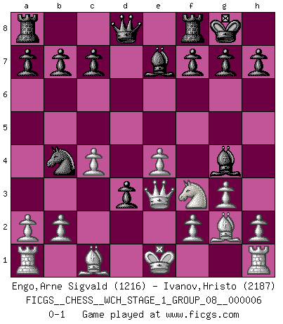 Last move : 0-1 2009 February 9 22:48:12 [Event "FICGS__CHESS__WCH_STAGE_1_GROUP_08__000006"] [Site "FICGS"] [Date "2009.02.03"] [Round "1"] [White "Engo,Arne Sigvald"] [Black "Ivanov,Hristo"] [Result "0-1"] [WhiteElo "1216"] [BlackElo "2187"] 1.c4 e5 2.Nc3 Nf6 3.g3 d5 4.e3 d4 5.exd4 exd4 6.Qe2+ Be7 7.Ne4 O-O 8.d3 Nc6 9.Nf3 Nxe4 10.dxe4 Bg4 11.Bg2 d3 12.Qe3 Nb4 0-1 English : Bremen, reverse Dragon Kingside Castling by player Black (move 7) Player Black won this chess game. Follow this game move after move (download)A thorough understanding of the typical mating continuations makes the most complicated sacrificial combinations leading up to them not only not difficult, but almost a matter of course. (Siegbert Tarrasch) Zu meiner Zeit war ein 20 jähriger ein junger Spieler, heute ist er ein Veteran. (Garry Kasparov) En partidas rápidas, el Caballo es mas poderoso que el Alfil. (Vlastimil Hort) Votre seul travail dans les ouvertures est d'obtenir un milieu de partie jouable. (Lajos Portish) Quotation,n.: The act of repeating erroneously the words of another. The words erroneously repeated. (Ambrose Bierce, The Devil's Dictionary)