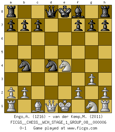 Last move : 0-1 2009 April 12 14:37:28 [Event "FICGS__CHESS__WCH_STAGE_1_GROUP_08__000006"] [Site "FICGS"] [Date "2009.02.03"] [Round "1"] [White "Engo,Arne Sigvald"] [Black "van der Kemp,Michel"] [Result "0-1"] [WhiteElo "1216"] [BlackElo "2011"] 1.c4 Nf6 2.Nc3 e5 3.e3 Nc6 4.g3 d5 5.cxd5 Nxd5 6.Bg2 Ndb4 7.d4 exd4 8.exd4 Bf5 9.Be4 Bxe4 10.Nxe4 Nxd4 0-1 This chess game has been lost on time (started : 2009.02.03 12:46:52) English Opening Player Black won this chess game. Follow this game move after move (download)All Chess players should have a hobby. (Savielly Tartakower) Alles was am Schachbrett zählt sind gute Züge. (Robert James Fischer) Dios mío, Bobby Fischer juega tan simple. (Alexei Suetin) Les Echecs mettent en conflit, non pas deux intelligences, mais deux volontés. (Lasker) Memory is a complicated thing, a relative to truth, but not its twin. (Barbara Kingsolver, Animal Dreams)