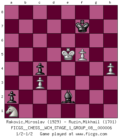 Last move : 1/2-1/2 2009 March 18 18:44:43 [Event "FICGS__CHESS__WCH_STAGE_1_GROUP_08__000006"] [Site "FICGS"] [Date "2009.02.03"] [Round "1"] [White "Rakovic,Miroslav"] [Black "Ruzin,Mikhail"] [Result "1/2-1/2"] [WhiteElo "1929"] [BlackElo "1701"] 1.d4 d5 2.c4 Nc6 3.cxd5 Qxd5 4.e3 e5 5.Nc3 Bb4 6.Bd2 Bxc3 7.bxc3 Nf6 8.Qb3 Qd6 9.Bc1 Be6 10.Ba3 Bxb3 11.Bxd6 Ba4 12.Bxe5 Nxe5 13.dxe5 Ne4 14.Bc4 Rd8 15.Ne2 Nd2 16.Bb3 Nxb3 17.axb3 Bxb3 18.Nd4 Bc4 19.f3 a6 20.Kf2 Rd5 21.f4 O-O 22.e4 Rc5 23.Rhd1 Re8 24.Kf3 a5 25.Ra3 b6 26.h3 h5 27.g3 f6 28.exf6 gxf6 29.g4 Kf8 30.Rd2 Bf1 31.f5 Bc4 32.Ra1 Bf7 33.Rd3 Rce5 34.Re3 c5 35.Nb5 Rd8 36.g5 fxg5 37.Rg1 c4 38.Nd4 Rde8 39.Rxg5 Bd5 40.Rxh5 Rxe4 41.Rxe4 Rxe4 42.Kf2 a4 43.Rh6 a3 44.Rxb6 Re8 45.Ra6 Ra8 46.Rxa8+ Bxa8 47.Ke3 Bg2 48.h4 Kf7 49.Nc2 a2 50.Kd4 Bf1 51.Ke5 Bd3 52.Na1 Be2 1/2-1/2 QGD : Chigorin defense Kingside Castling by player Black (move 21) 10 pieces endgame at move 46 : White KRNPPP , Black KBPP WHITE : King + 1 Rook 1 Knight 3 Pawns BLACK : King + 1 Bishop 2 Pawns 9 pieces endgame at move 46 : White KNPPP , Black KBPP WHITE : King + 1 Knight 3 Pawns BLACK : King + 1 Bishop 2 Pawns This chess game ended in a draw. Follow this game move after move (download)Capture of the adverse King is the ultimate but not the first object of the game. (William Steinitz) Moralische Siege zählen nicht. (Savielly Grigorievitsch Tartakower) Cuando me preguntan: -¿Cual es el secreto que te hace hacer mejores movidas que tus oponentes?, Yo respondo: Me da gusto que me pregunten eso, porque, como veran, hay una simple razón. Yo pienso mis propias movidas y dejo a mi oponente que el piense las suyas. (Alexander Alekhine) Mon pion favori sur ma case favorite ! Bronstein en parlant d'un coup de pion en h5 quand il avait les Noirs. To send light into the darkness of men's hearts - such is the duty of the artist. (Schumann)