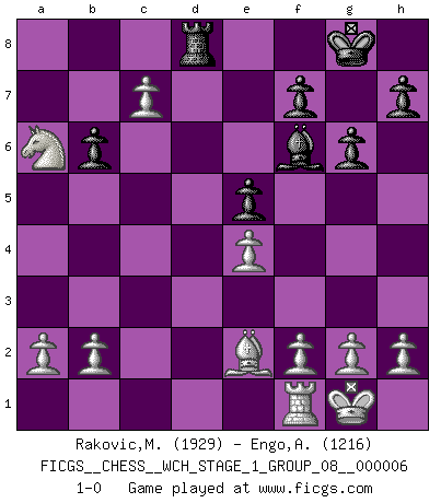 Last move : 1-0 2009 February 18 16:11:23 [Event "FICGS__CHESS__WCH_STAGE_1_GROUP_08__000006"] [Site "FICGS"] [Date "2009.02.03"] [Round "1"] [White "Rakovic,Miroslav"] [Black "Engo,Arne Sigvald"] [Result "1-0"] [WhiteElo "1929"] [BlackElo "1216"] 1.d4 Nf6 2.c4 g6 3.Nc3 Bg7 4.e4 d6 5.Nf3 O-O 6.Be2 Nc6 7.d5 Ne5 8.Nxe5 dxe5 9.Bg5 e6 10.O-O exd5 11.cxd5 b6 12.Rc1 Bb7 13.Nb5 Rc8 14.Nxa7 Ra8 15.Nb5 Ba6 16.Nxc7 Rc8 17.Nxa6 Rxc1 18.Qxc1 Qd6 19.Bxf6 Bxf6 20.Qc6 Qxc6 21.dxc6 Rd8 22.c7 1-0 King's Indian : 6.Be2 Kingside Castling by player Black (move 5) Kingside Castling by player White (move 10) Player White won this chess game. Follow this game move after move (download)I'm not afraid of Spassky. The world knows I'm the best. You don't need a match to prove it. (Bobby Fischer) Fischer: 'Remis!?' Uhlmann: 'Aber es muss doch dreimal Zugwiederholung sein!' Fischer: 'Sie nehmen das Remis an, wie ich es sage, sonst spiele ich weiter und werde Sie dann schlagen!' (Robert James Fischer) Personalmente, yo prefiero mirar hacia el futuro en donde un programa de computadora gane el título mundial de Ajedrez. La humanidad necesita una lección de humildad. (Richard Dawkings) Avant la finale, les dieux ont créé le milieu de partie. (Tarrasch) No, no, you're not thinking; you're just being logical. (Niels Bohr)