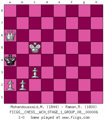 Last move : 1-0 2009 May 27 20:56:56 [Event "FICGS__CHESS__WCH_STAGE_1_GROUP_08__000006"] [Site "FICGS"] [Date "2009.02.03"] [Round "1"] [White "Mohandoussaid,Malik"] [Black "Raman,Ranganathan"] [Result "1-0"] [WhiteElo "1844"] [BlackElo "1800"] 1.e4 g6 2.d4 Nf6 3.Be3 Nxe4 4.Bd3 Nf6 5.f3 c6 6.Ne2 d5 7.Nd2 Bg7 8.Nf1 Nbd7 9.Nfg3 Nh5 10.Qd2 Ndf6 11.c3 O-O 12.Bh6 Be6 13.Bxg7 Kxg7 14.Nxh5+ Nxh5 15.g4 Nf6 16.h4 Qd6 17.h5 Rh8 18.O-O-O Ng8 19.Rh4 Nf6 20.Rdh1 Ng8 21.hxg6 fxg6 22.f4 Nh6 23.Rxh6 Bxg4 24.f5 Qf6 25.Nf4 Bxf5 26.Nh5+ gxh5 27.Rxf6 Kxf6 28.Bxf5 Kxf5 29.Rxh5+ Ke6 30.Qe2+ Kd7 31.Qg4+ e6 32.Qg7+ Kd6 33.Rxh7 Rxh7 34.Qxh7 b5 35.Qh2+ Ke7 36.Qc7+ Kf6 37.Qxc6 Rh8 38.Qxb5 Rh1+ 39.Kc2 Kf5 40.Qd7 a5 41.Qf7+ Ke4 42.Qxe6+ Kf4 43.Qxd5 Rg1 44.Qxa5 Ke3 45.Qe5+ Kf2 46.Qf4+ Ke2 47.d5 Rf1 48.Qc4+ Kf2 49.Qxf1+ Kxf1 50.d6 Ke2 51.d7 Ke3 52.d8Q Ke4 53.Qe7+ Kd5 54.Kd3 Kc6 55.Kd4 Kb5 56.Qd6 Ka5 57.Kc5 Ka4 58.Qa6+ 1-0 Robatsch (Modern) defense Kingside Castling by player Black (move 11) Queenside Castling by player White (move 18) 10 pieces endgame at move 42 : White KQPPPP , Black KRPP WHITE : King + 1 Queen 4 Pawns BLACK : King + 1 Rook 2 Pawns 9 pieces endgame at move 43 : White KQPPPP , Black KRP WHITE : King + 1 Queen 4 Pawns BLACK : King + 1 Rook 1 Pawn 8 pieces endgame at move 44 : White KQPPPP , Black KR WHITE : King + 1 Queen 4 Pawns BLACK : King + 1 Rook 7 pieces endgame at move 49 : White KQPPPP , Black K WHITE : King + 1 Queen 4 Pawns BLACK : King + 6 pieces endgame at move 49 : White KPPPP , Black K WHITE : King + 4 Pawns BLACK : King + Promotion Queen by player White (move 52) Player White won this chess game. Follow this game move after move (download)The beauty of a move lies not in its' appearance but in the thought behind it. (Siegbert Tarrasch) Bobby Fischer ist kein Vorbild für die heutige Jugend. (Viktor Kortschnoi) Fischer es una tragedia del Ajedrez Americano a la par con Morphy y Pillsbury. (Mig Greengard) La tactique est l'élément le plus important du milieu de jeu. (Siegbert Tarrasch) Life doesn't imitate art, it imitates bad television. (Woody Allen)