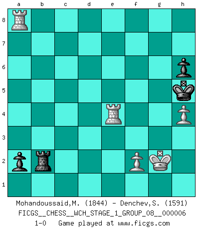 Last move : 1-0 2009 June 16 8:42:4 [Event "FICGS__CHESS__WCH_STAGE_1_GROUP_08__000006"] [Site "FICGS"] [Date "2009.02.03"] [Round "1"] [White "Mohandoussaid,Malik"] [Black "Denchev,Stanimir"] [Result "1-0"] [WhiteElo "1844"] [BlackElo "1591"] 1.c4 e5 2.Nc3 Nf6 3.d3 Nc6 4.Nf3 d6 5.g3 Be7 6.Bg2 h6 7.O-O O-O 8.a3 Be6 9.b4 Qd7 10.Rb1 Bh3 11.a4 Bxg2 12.Kxg2 Nd4 13.e3 Nxf3 14.Qxf3 c6 15.e4 Rfd8 16.Be3 d5 17.exd5 cxd5 18.Bc5 b6 19.Bxe7 Qxe7 20.Nxd5 Nxd5 21.cxd5 Qd7 22.b5 Qxd5 23.Rbc1 Qxf3+ 24.Kxf3 Rxd3+ 25.Kg2 Rd4 26.a5 bxa5 27.Ra1 a4 28.Rfc1 Rb8 29.Rc7 Rxb5 30.Rxa7 R5b4 31.Rc1 Rdc4 32.Rd1 Rd4 33.Rc1 f5 34.R1c7 Rg4 35.h3 Rg6 36.Rc8+ Kh7 37.R7a8 Re6 38.h4 Kg6 39.Ra7 e4 40.R8c7 Kf6 41.Rxg7 Rc6 42.Rae7 Ra6 43.Rgf7+ Kg6 44.Rg7+ Kh5 45.Re5 Rg6 46.Rxf5+ Kg4 47.Rf4+ Kh5 48.g4+ Rxg4+ 49.R7xg4 a3 50.Rg8 a2 51.Ra8 Rb2 52.Rxe4 1-0 English Opening Kingside Castling by player White (move 7) Kingside Castling by player Black (move 7) 10 pieces endgame at move 49 : White KRRPP , Black KRPPP WHITE : King + 2 Rooks 2 Pawns BLACK : King + 1 Rook 3 Pawns 9 pieces endgame at move 52 : White KRRPP , Black KRPP WHITE : King + 2 Rooks 2 Pawns BLACK : King + 1 Rook 2 Pawns Player White won this chess game. Follow this game move after move (download)There must have been a time when men were demigods, or they could not have invented Chess. (Gustav Schenk) Vom Schach wurde gesagt das Leben sei dafür nicht lange genug. Aber das ist der Fehler des Lebens, nicht des Schach'. (Irving Chernev) Botvinnik trataba de restarle el misterio al Ajedrez, siempre relacionandolo a situaciones de la vida ordinaria. El gustaba de llamar al Ajedrez un típico problema inexacto similar a aquellos de los cuales la gente siempre tiene que enfrentarse en la vida cotidiana. (Garry Kasparov) La solitude du joueur d'Echecs à l'approche du mat est semblable à celle du condamné. (Francis Szpiner) Life is pain my dear and anyone who says otherwise is selling something. (Princess Bride)