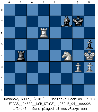 Last move : 1/2-1/2 2009 May 15 6:44:4 [Event "FICGS__CHESS__WCH_STAGE_1_GROUP_09__000006"] [Site "FICGS"] [Date "2009.02.03"] [Round "1"] [White "Domanov,Dmitry"] [Black "Borisovs,Leonids"] [Result "1/2-1/2"] [WhiteElo "2181"] [BlackElo "2132"] 1.e4 c5 2.Nf3 Nc6 3.d4 cxd4 4.Nxd4 e5 5.Nb5 d6 6.c4 Be7 7.N1c3 a6 8.Na3 Be6 9.Bd3 Bg5 10.Nc2 Bxc1 11.Rxc1 Nf6 12.O-O O-O 13.Qd2 Rc8 14.Nd5 Nd7 15.Rfd1 Nc5 16.b3 f5 17.exf5 Nxd3 18.Qxd3 Bxf5 19.Qe3 b5 20.Ncb4 Nxb4 21.Nxb4 bxc4 22.Rxc4 Rxc4 23.bxc4 Be6 24.Nd5 Qb8 25.Qd2 Bg4 26.f3 Be6 27.h3 Qb7 28.Qd3 Rc8 29.Rb1 Qa7+ 30.Kh2 Rc5 31.Ne3 Rc6 32.Qe4 Rb6 33.Rd1 Qd7 34.c5 Rc6 35.cxd6 Rxd6 36.Rc1 Rb6 37.Qxe5 Qd6 38.Nc4 Qxe5+ 39.Nxe5 Rb5 40.f4 g5 41.Rc6 Bxa2 42.Rxa6 gxf4 43.Nd3 Bf7 44.Nxf4 Kg7 45.Kg3 h5 46.Rc6 Rb3+ 47.Kh4 Rb4 48.g3 Re4 49.Ra6 Rb4 50.Rd6 1/2-1/2 Sicilian : Labourdonnais-Loewenthal (Kalashnikov) variation Kingside Castling by player White (move 12) Kingside Castling by player Black (move 12) 10 pieces endgame at move 42 : White KRNPP , Black KRBPP WHITE : King + 1 Rook 1 Knight 2 Pawns BLACK : King + 1 Rook 1 Bishop 2 Pawns 9 pieces endgame at move 44 : White KRNPP , Black KRBP WHITE : King + 1 Rook 1 Knight 2 Pawns BLACK : King + 1 Rook 1 Bishop 1 Pawn This chess game ended in a draw. Follow this game move after move (download)I still hope to kill Fischer. (Boris Spassky) Im Spitzenschach von heute geht es nur um Vorbereitung, um tiefgründige, sorgfältige Eröffnungsvorbereitung. (Nigel Short) La mitad de las variaciones que son calculadas en una partida de torneo, resultan ser completamente superfluas. Desafortunadamente, nadie sabe por adelantado cual mitad. (Jan Tinman) Un millionnaire : 'Monsieur Steinitz ! Vous ne participez aux tournois que pour l'argent, alors que moi je n'y viens que pour l'honneur.' Steinitz : 'Chacun joue pour ce qu'il n'a pas'... Go and wake up your luck. (Persian saying)