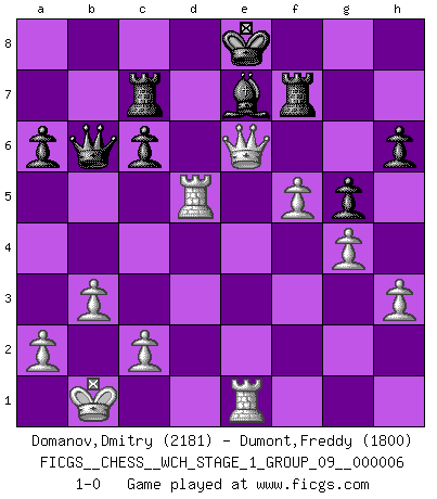 Last move : 1-0 2009 March 20 22:53:41 [Event "FICGS__CHESS__WCH_STAGE_1_GROUP_09__000006"] [Site "FICGS"] [Date "2009.02.03"] [Round "1"] [White "Domanov,Dmitry"] [Black "Dumont,Freddy"] [Result "1-0"] [WhiteElo "2181"] [BlackElo "1800"] 1.e4 c5 2.Nf3 d6 3.d4 cxd4 4.Nxd4 Nf6 5.Nc3 e6 6.g4 h6 7.h3 Nc6 8.Bg2 Be7 9.Be3 a6 10.f4 Qc7 11.Qe2 Na5 12.O-O-O Nc4 13.Bf2 Bd7 14.Rd3 Rc8 15.b3 Nb6 16.Kb1 Bc6 17.Re1 g5 18.e5 dxe5 19.Bxc6+ bxc6 20.Nxe6 fxe6 21.Bxb6 Qxb6 22.Qxe5 Rc7 23.Qxe6 Rf8 24.f5 Rf7 25.Nd5 Nxd5 26.Rxd5 1-0 Sicilian : Scheveningen, Keres attack Queenside Castling by player White (move 12) Player White won this chess game. Follow this game move after move (download)We must make sure that Chess will not be like a dead language, very interesting, but for a very small group. (Sytze Faber) Frage: Gibt es etwas was Sie mehr lieben als Autobahnen ohne Tempobegrenzungen? - Antwort: Deutsche Frauen ohne Tempobegrenzungen. (Loek van Wely) Uno por uno, yo los acribillé, mi superioridad muy pronto se volvio aparente. (Jose Capablanca) Les Echecs mettent en conflit, non pas deux intelligences, mais deux volontés. (Lasker) To err is human, to shift the blame on someone else is tactical. (Mladen Jankovic)