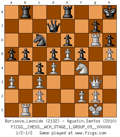 Last move : 1/2-1/2 2009 May 30 17:12:51 [Event "FICGS__CHESS__WCH_STAGE_1_GROUP_09__000006"] [Site "FICGS"] [Date "2009.02.03"] [Round "1"] [White "Borisovs,Leonids"] [Black "Agustin,Santos"] [Result "1/2-1/2"] [WhiteElo "2132"] [BlackElo "2010"] 1.e4 e6 2.d4 d5 3.Nc3 Nf6 4.Bg5 Bb4 5.e5 h6 6.Bd2 Bxc3 7.bxc3 Ne4 8.Qg4 Kf8 9.Bd3 Nxd2 10.Kxd2 c5 11.h4 Nc6 12.Rh3 c4 13.Be2 Bd7 14.Qf4 Kg8 15.Bh5 Be8 16.Ke2 f5 17.Bxe8 Qxe8 18.h5 Kh7 19.Kf1 Qf7 20.Rb1 Rab8 21.Ne2 b5 22.Qd2 a5 23.a3 Qe7 24.Nf4 Rhe8 25.Ra1 Kg8 26.Rg3 Nd8 27.Rg6 Qd7 28.Qe3 Nc6 29.Rb1 Kh8 30.Kg1 Rb6 31.Qg3 R6b8 1/2-1/2 French : MacCutcheon, Lasker variation This chess game ended in a draw. Follow this game move after move (download)A bad day of Chess is better than any good day at work. (Anonymous) Wenn ein Kopf und ein Buch zusammenstoßen und es klingt hohl, ist es denn allemal im Buche? (Georg Christoph Lichtenberg) El Ajedrez es el arte del análisis. (Mikhail Botvinnik) Pour se monter efficace, un Cavalier a besoin d'avant-postes ! Les Cavaliers font les meilleurs bloqueurs de pions passés. Industry executives and analysts often mistakenly talk about strategy as if it were some kind of chess match. But in chess, you have just two opponents, each with identical resources, and with luck playing a minimal role. The real world is much more like a poker game, with multiple players trying to make the best of whatever hand fortune has dealt them. In our industry, Bill Gates owns the table until someone proves otherwise. (David Moschella, 'Computerworld')