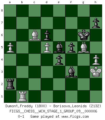 Last move : 0-1 2009 May 17 11:8:43 [Event "FICGS__CHESS__WCH_STAGE_1_GROUP_09__000006"] [Site "FICGS"] [Date "2009.02.03"] [Round "1"] [White "Dumont,Freddy"] [Black "Borisovs,Leonids"] [Result "0-1"] [WhiteElo "1800"] [BlackElo "2132"] 1.e4 c5 2.Nf3 Nc6 3.d4 cxd4 4.Nxd4 e5 5.Nb5 d6 6.N1c3 a6 7.Na3 Be6 8.Nc4 b5 9.Ne3 Nf6 10.Ned5 Ne7 11.Nxf6+ gxf6 12.Nd5 Nxd5 13.exd5 Bd7 14.c3 f5 15.Be2 Bg7 16.O-O O-O 17.Kh1 f4 18.g3 fxg3 19.fxg3 Bh3 20.Rf2 Qb6 21.Kg1 f5 22.Qd3 e4 23.Qe3 Qxe3 24.Bxe3 b4 25.cxb4 Bxb2 26.Rb1 Be5 27.a4 Rfc8 28.Rb3 Rc7 29.Bf1 Bg4 30.b5 axb5 31.Bxb5 Rb8 32.Kg2 Kg7 33.h3 Bd1 34.Ra3 Kg6 35.Bc6 Bb2 36.Ra2 Bf3+ 37.Kh2 Be5 38.a5 Rb1 39.Rg2 Kf6 40.Rg1 Rg7 41.Rxb1 Rxg3 42.h4 Rg2+ 43.Kh3 Rxa2 44.Bg5+ Kg6 0-1 Sicilian : Labourdonnais-Loewenthal (Kalashnikov) variation Kingside Castling by player White (move 16) Kingside Castling by player Black (move 16) Player Black won this chess game. Follow this game move after move (download)The enormous mental resilience, without which no Chess player can exist, was so much taken up by Chess that he could never free his mind of this game. (Albert Einstein) Nie in meinem Leben habe ich die französische Verteidigung gespielt, welche die Stumpfsinnigste von allen ist. (Wilhelm Steinitz) Evita las multitudes. Haz independientemente tu propio razonamiento. Trata de ser el jugador de Ajedrez, no la pieza de Ajedrez. (Ralph Charell) Celui qui prend des risques peut perdre, celui qui n'en prend pas perd toujours. (Xavier Tartacover) Sometimes it pays to stay in bed in Monday, rather than spending the rest of the week debugging Monday's code. (Dan Salomon)