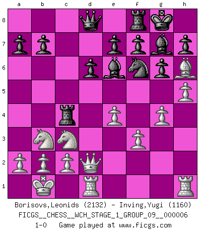 Last move : 1-0 2009 March 6 3:50:58 [Event "FICGS__CHESS__WCH_STAGE_1_GROUP_09__000006"] [Site "FICGS"] [Date "2009.02.03"] [Round "1"] [White "Borisovs,Leonids"] [Black "Inving,Yugi"] [Result "1-0"] [WhiteElo "2132"] [BlackElo "1160"] 1.e4 c5 2.Nf3 d6 3.d4 cxd4 4.Nxd4 Nf6 5.Nc3 g6 6.Be3 Bg7 7.f3 O-O 8.Qd2 Bd7 9.O-O-O Nc6 10.g4 Rc8 11.Kb1 Ne5 12.h4 Qa5 13.Be2 Nc4 14.Bxc4 Rxc4 15.Nb3 Qd8 16.h5 Be6 17.Bh6 1-0 Sicilian : Dragon, Yugoslav attack, 7...O-O Kingside Castling by player Black (move 7) Queenside Castling by player White (move 9) Player White won this chess game. Follow this game move after move (download)Fischer is the strongest player in the world. In fact, the strongest player who ever lived. (Larry Evans) Alles was am Schachbrett zählt sind gute Züge. (Robert James Fischer) La partida mas dura de ganar es una partida ganada. (Emanuel Lasker) C'est la seule position que je connaisse où les deux camps sont mals. Propos prêtés à V. Anand. Coffee just isn't my cup of tea. (Unknown)
