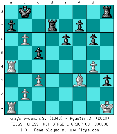 Last move : 1-0 2009 May 8 19:21:12 [Event "FICGS__CHESS__WCH_STAGE_1_GROUP_09__000006"] [Site "FICGS"] [Date "2009.02.03"] [Round "1"] [White "Kragujevcanin,Stole"] [Black "Agustin,Santos"] [Result "1-0"] [WhiteElo "1843"] [BlackElo "2010"] 1.e4 e6 2.d4 d5 3.Nc3 dxe4 4.Nxe4 Nd7 5.Nf3 Ngf6 6.Bg5 h6 7.Bxf6 Nxf6 8.Bd3 Nxe4 9.Bxe4 c5 10.Qe2 Qa5+ 11.c3 cxd4 12.Nxd4 Qc7 13.O-O Be7 14.Rfe1 Bd7 15.Nf5 Bf8 16.a4 O-O-O 17.Nd4 Bd6 18.Nb5 Bxh2+ 19.Kh1 Bxb5 20.axb5 Kb8 21.Qe3 b6 22.g3 Bxg3 23.fxg3 h5 24.Ra4 h4 25.g4 g6 26.Bg2 h3 27.Bf3 Rd7 28.Rea1 Qc5 29.Qxc5 bxc5 30.b6 1-0 French : Rubinstein variation Kingside Castling by player White (move 13) Queenside Castling by player Black (move 16) Player White won this chess game. Follow this game move after move (download)I feel as if I were a piece in a game of Chess, when my opponent says of it: That piece cannot be moved. (Soren Kierkegaard) Viele Opfer benötigen überhaupt keine konkrete Berechnung. Es genügt sich die entstehende Position kurz vorzustellen, um uns davon zu überzeugen, dass das Opfer korrekt ist. (Mikhail Nekhemyevich Tal) Mi estilo es algo parecido entre un poco de Tal y Petrosian. (Reshevsky) Pour moi, les échecs ne sont pas un jeu mais un art. (Alexandre Alekhine) Without enthusiasm, virtue functions not at all, and vice only poorly. (Mignon McLaughlin, The Neurotic's Notebook, 1960)