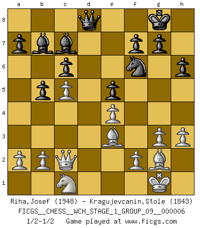 Last move : 1/2-1/2 2009 February 20 19:56:36 [Event "FICGS__CHESS__WCH_STAGE_1_GROUP_09__000006"] [Site "FICGS"] [Date "2009.02.03"] [Round "1"] [White "Riha,Josef"] [Black "Kragujevcanin,Stole"] [Result "1/2-1/2"] [WhiteElo "1948"] [BlackElo "1843"] 1.g3 d5 2.Bg2 Nf6 3.Nf3 c6 4.O-O h6 5.d3 Nbd7 6.c4 e6 7.Nc3 Bd6 8.e4 dxc4 9.dxc4 Qe7 10.Qc2 O-O 11.h3 Ne5 12.Nxe5 Bxe5 13.Be3 Bc7 14.Rad1 e5 15.Ne2 b6 16.Rfe1 Re8 17.c5 Bb7 18.Rd2 Rad8 19.Red1 Rxd2 20.Rxd2 Rd8 21.Rxd8+ Qxd8 22.Nc1 b5 1/2-1/2 Benko's Opening Kingside Castling by player White (move 4) Kingside Castling by player Black (move 10) This chess game ended in a draw. Follow this game move after move (download)Morphy was probably the greatest genius of them all. (Bobby Fischer) Das Schachspiel übertrifft alle anderen Spiele so weit wie der Chimborasso einen Misthaufen. (Arthur Schopenhauer) No volvere nunca a jugar contigo. Has insultado a mi amigo. - cuando un oponente se maldijo por una mala jugada (Miguel Najdorf) Je menace de comprendre la position. (Anonyme) Perhaps the current trend of many chess professionals taking up the more lucrative pastime of poker is not a wholly negative one. It may not be too late for humans to relearn how to take risks in order to innovate and thereby maintain the advanced lifestyles we enjoy. And if it takes a poker-playing supercomputer to remind us that we can't enjoy the rewards without taking the risks, so be it. (The Chess Master and the Computer, by Garry Kasparov - 2010)