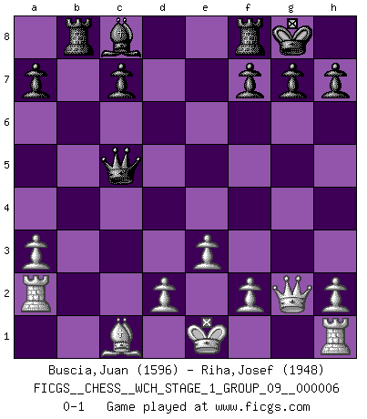 Last move : 0-1 2009 March 23 11:45:54 [Event "FICGS__CHESS__WCH_STAGE_1_GROUP_09__000006"] [Site "FICGS"] [Date "2009.02.03"] [Round "1"] [White "Buscia,Juan"] [Black "Riha,Josef"] [Result "0-1"] [WhiteElo "1596"] [BlackElo "1948"] 1.c4 e5 2.Nc3 Nf6 3.Nf3 Nc6 4.e3 Bb4 5.Qc2 Bxc3 6.Qxc3 Qe7 7.a3 O-O 8.b4 d5 9.cxd5 Nxd5 10.Qc2 e4 11.b5 exf3 12.bxc6 fxg2 13.Bxg2 bxc6 14.Qxc6 Nf4 15.Qe4 Nxg2+ 16.Qxg2 Rb8 17.Ra2 Qc5 0-1 This chess game has been lost on time (started : 2009.02.03 12:50:19) English Opening Kingside Castling by player Black (move 7) Player Black won this chess game. Follow this game move after move (download)Bobby is the finest Chess player this country ever produced. His memory for the moves, his brilliance in dreaming up combinations, and his fierce determination to win are uncanny. (John Collins) Der Traum, für den ich lebe, ist der von einem freien Russland. Viele mögen sagen: Russland hat doch ein Parlament, einen gewählten Präsidenten. Aber ich spüre, dass in meiner Heimat die Angst wiederkehrt. Eine Angst, sich frei zu äußern, bestimmte Dinge zu tun (Garry Kasparov) Sin errores no puede haber brillantez. (Emanuel Lasker) Mais n'est-ce pas déjà le limiter injurieusement que d'appeler les échecs un jeu? N'est-ce pas aussi une science, un art, ou quelque chose qui, comme le cercueil de Mahomet entre ciel et terre, est suspendu entre l'un et l'autre, et qui réunit un nombre incroyable de contraires ? (Stefan Zweig) After growing wildly for years, the field of computing appears to be reaching its infancy. (John Pierce)