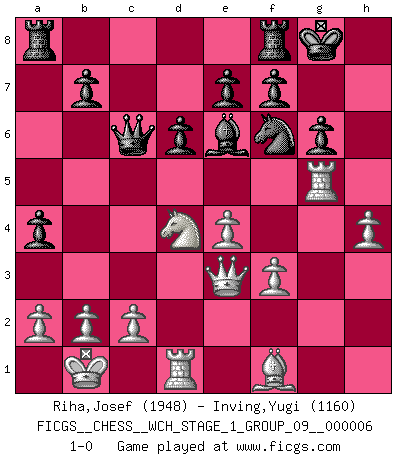 Last move : 1-0 2009 March 2 4:14:25 [Event "FICGS__CHESS__WCH_STAGE_1_GROUP_09__000006"] [Site "FICGS"] [Date "2009.02.03"] [Round "1"] [White "Riha,Josef"] [Black "Inving,Yugi"] [Result "1-0"] [WhiteElo "1948"] [BlackElo "1160"] 1.e4 c5 2.Nf3 d6 3.d4 cxd4 4.Nxd4 Nf6 5.Nc3 g6 6.Be3 Bg7 7.f3 O-O 8.Qd2 Bd7 9.g4 Nc6 10.O-O-O Qa5 11.Nb3 Qd8 12.Kb1 Be6 13.h4 h5 14.gxh5 Nxh5 15.Rg1 a5 16.Nd4 Nxd4 17.Bxd4 Bxd4 18.Qxd4 Qc7 19.Rg5 a4 20.Qe3 Nf6 21.Nb5 Qc6 22.Nd4 1-0 Sicilian : Dragon, Yugoslav attack, 7...O-O Kingside Castling by player Black (move 7) Queenside Castling by player White (move 10) Player White won this chess game. Follow this game move after move (download)You know you're going to lose. Even when I was ahead I knew I was going to lose. - On playing against Fischer. (Andrew Soltis) Karpov ist ein Museumsstück. (Garry Kasparov) La estratégia requiere pensar, la táctica requiere observación. (Max Euwe) Echiquier : carré parfait, comme la Jérusalem nouvelle décrite par l'auteur de l'Apocalypse, huit cases sur huit, exaltation du chiffre 4, symbole du cosmos aux quatre horizons... où le noir et le blanc, l'ombre et la lumière, le mal et le bien s'entremêlent et se conjuguent. (Robert Couffignal, Le Gambit du poète) Success without honor is an unseasoned dish; it will satisfy your hunger, but it won't taste good. (Joe Paterno)
