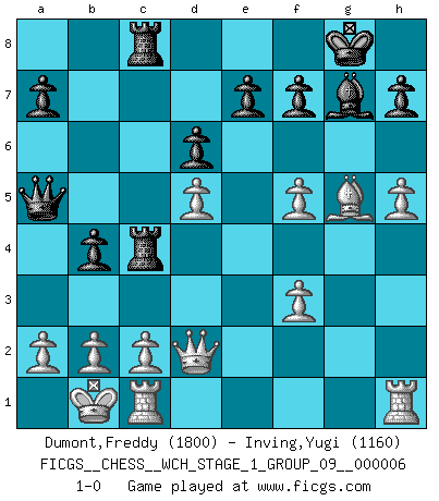 Last move : 1-0 2009 March 18 1:57:48 [Event "FICGS__CHESS__WCH_STAGE_1_GROUP_09__000006"] [Site "FICGS"] [Date "2009.02.03"] [Round "1"] [White "Dumont,Freddy"] [Black "Inving,Yugi"] [Result "1-0"] [WhiteElo "1800"] [BlackElo "1160"] 1.e4 c5 2.Nf3 d6 3.d4 cxd4 4.Nxd4 Nf6 5.Nc3 g6 6.Be3 Bg7 7.f3 O-O 8.Qd2 Nc6 9.Bc4 Bd7 10.h4 Ne5 11.Bb3 Rc8 12.O-O-O Qa5 13.Kb1 Rfe8 14.g4 b5 15.h5 b4 16.Nd5 Nxd5 17.exd5 g5 18.Bxg5 Nc4 19.Bxc4 Rxc4 20.Nf5 Bxf5 21.gxf5 Rec8 22.Rc1 1-0 Sicilian : Dragon, Yugoslav attack, 7...O-O Kingside Castling by player Black (move 7) Queenside Castling by player White (move 12) Player White won this chess game. Follow this game move after move (download)Chess is not like life... it has rules ! (Mark Pasternak) Capablanka war das größte Genie der Schachgeschichte! Aber denken sie nicht er habe nichts vom Schach verstanden. Er wusste nur soviel wie er wissen musste um seine Ziele zu erreichen. (Mikhail Moiseyevich Botvinik) ¿Cual es el objetivo de jugar una apertura de gambito?... Para adquirir una reputación de ser un jugador apuesto a costo de perder el juego. (Siegbert Tarrasch) L'ordinateur a tué l'originalité. Il n'y a plus guère d'aventures sur l'échiquier. (Jacob Murray) The general who wins the battle makes many calculations in his temple before the battle is fought. The general who loses makes but few calculations beforehand. (Sun Tzu)