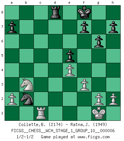 Last move : 1/2-1/2 2009 March 31 1:38:20 [Event "FICGS__CHESS__WCH_STAGE_1_GROUP_10__000006"] [Site "FICGS"] [Date "2009.02.03"] [Round "1"] [White "Collette,Benjamin"] [Black "Ratna,Jean-Michel"] [Result "1/2-1/2"] [WhiteElo "2174"] [BlackElo "1949"] 1.d4 Nf6 2.c4 g6 3.Nc3 d5 4.cxd5 Nxd5 5.e4 Nxc3 6.bxc3 Bg7 7.Bc4 O-O 8.Ne2 c5 9.O-O Nc6 10.Be3 Na5 11.Bd3 b6 12.Rc1 e5 13.dxc5 Be6 14.c4 bxc5 15.Bxc5 Bh6 16.Bxf8 Bxc1 17.Nxc1 Kxf8 18.Nb3 Bxc4 19.Bxc4 Nxc4 20.Qxd8+ Rxd8 21.Rc1 Nb2 22.f3 1/2-1/2 King's Indian defense, 3.Nc3 Kingside Castling by player Black (move 7) Kingside Castling by player White (move 9) This chess game ended in a draw. Follow this game move after move (download)Up to this point White has been following well-known analysis. But now he makes a fatal error: he begins to use his own head. (Siegbert Tarrasch) Bis jetzt ist Weiß einer wohlbekannten Analyse gefolgt. Aber jetzt begeht er einen schrecklichen Fehler: Er beginnt seinen eigenen Kopf zu benutzen. (Siegbert Tarrasch) Al jugar al Ajedrez entonces, podemos aprender: Primero: Previsión... Segundo: Prudencia... Tercero: Cautela... Y al final, aprendemos del Ajedrez el hábito de no ser desanimados por apariencias malas presentes en el estado de nuestros asuntos, el hábito de la esperanza por una oportunidad favorable y la perseveración de los secretos de los recursos. (Benjamin Franklin) Votre prénom est 'Tactique', votre deuxième prénom est 'Tactique' et votre nom est 'Tactique'. (Ken Smith) Art is the only way to run away without leaving home. (Twyla Tharp)